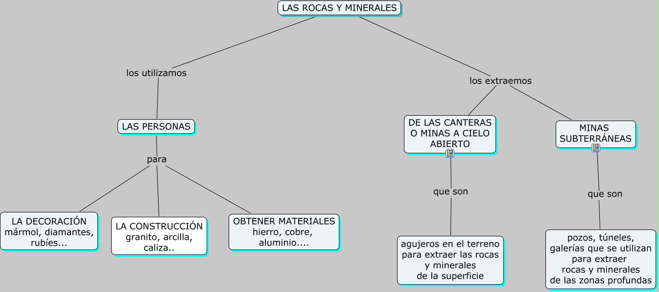 Este Cmap, tiene información relacionada con: rocas y minerales, DE LAS CANTERAS O MINAS A CIELO ABIERTO que son agujeros en el terreno para extraer las rocas y minerales de la superficie, LAS PERSONAS para LA DECORACIÓN mármol, diamantes, rubíes..., LAS PERSONAS para OBTENER MATERIALES hierro, cobre, aluminio...., LAS ROCAS Y MINERALES los extraemos MINAS SUBTERR�?NEAS, LAS ROCAS Y MINERALES los utilizamos LAS PERSONAS, LAS PERSONAS para LA CONSTRUCCIÓN granito, arcilla, caliza.., LAS ROCAS Y MINERALES los extraemos DE LAS CANTERAS O MINAS A CIELO ABIERTO, MINAS SUBTERR�?NEAS que son pozos, túneles, galerías que se utilizan para extraer rocas y minerales de las zonas profundas
