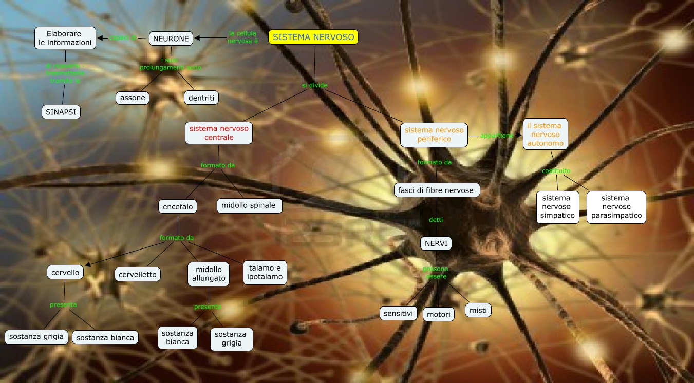 Questa Cmap, creata con IHMC CmapTools, contiene informazioni relative a: sistema nervoso, sistema nervoso periferico formato da fasci di fibre nervose, cervello presenta sostanza bianca, Elaborare le informazioni di riceverle - trasmetterle tramite le SINAPSI, NEURONE capaci di Elaborare le informazioni, NEURONE i suoi prolungamenti sono dentriti, encefalo formato da talamo e ipotalamo, NERVI possono essere misti, midollo allungato presenta sostanza bianca, NERVI possono essere sensitivi, il sistema nervoso autonomo costituito sistema nervoso simpatico, NEURONE i suoi prolungamenti sono assone, encefalo formato da cervello, sistema nervoso centrale formato da midollo spinale, encefalo formato da midollo allungato, SISTEMA NERVOSO si divide sistema nervoso periferico, fasci di fibre nervose detti NERVI, midollo allungato presenta sostanza grigia, NERVI possono essere motori, SISTEMA NERVOSO la cellula nervosa è NEURONE, sistema nervoso centrale formato da encefalo