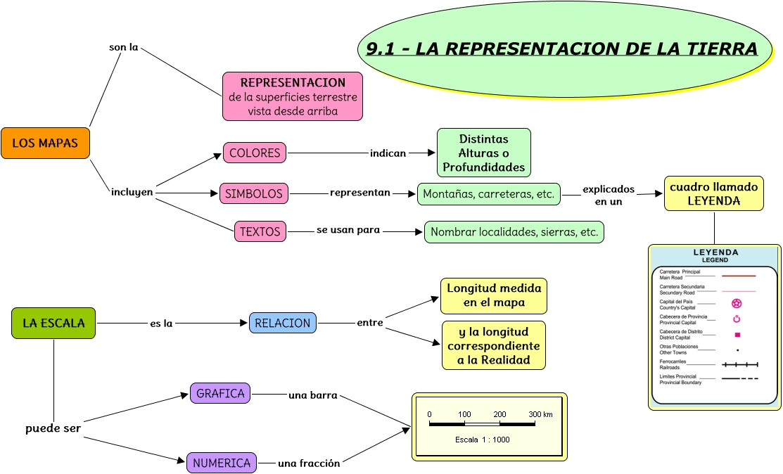 Este Cmap, tiene información relacionada con: 9.1 - LA REPRESENTACION DE LA TIERRA, RELACION entre Longitud medida en el mapa, GRAFICA una barra, LA ESCALA puede ser NUMERICA, NUMERICA una fracción, LA ESCALA puede ser GRAFICA, LOS MAPAS son la REPRESENTACION de la superficies terrestre vista desde arriba, RELACION entre y la longitud correspondiente a la Realidad, TEXTOS se usan para Nombrar localidades, sierras, etc., LOS MAPAS incluyen COLORES, LOS MAPAS incluyen SIMBOLOS, cuadro llamado LEYENDA ????, Montañas, carreteras, etc. explicados en un cuadro llamado LEYENDA, COLORES indican Distintas Alturas o Profundidades, LOS MAPAS incluyen TEXTOS, SIMBOLOS representan Montañas, carreteras, etc., LA ESCALA es la RELACION