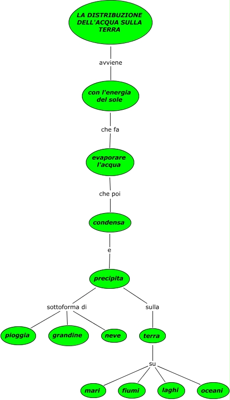 Questa Cmap, creata con IHMC CmapTools, contiene informazioni relative a: LA DISTRIBUZIONE DELL' ACQUA, LA DISTRIBUZIONE DELL'ACQUA SULLA TERRA avviene con l'energia del sole, condensa e precipita, evaporare l'acqua che poi condensa, terra su mari, con l'energia del sole che fa evaporare l'acqua, precipita sottoforma di pioggia, terra su oceani, terra su fiumi, precipita sulla terra, terra su laghi, precipita sottoforma di neve, precipita sottoforma di grandine