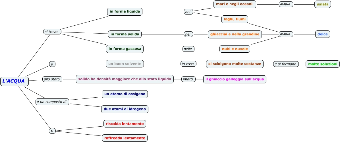 Questa Cmap, creata con IHMC CmapTools, contiene informazioni relative a: L'acqua, ghiacciai e nella grandine acqua dolce, un buon solvente in essa si sciolgono molte sostanze, L'ACQUA è un composto di un atomo di ossigeno, in forma liquida nei laghi, fiumi, solido ha densità maggiore che allo stato liquido infatti il ghiaccio galleggia sull'acqua, L'ACQUA si trova in forma liquida, L'ACQUA si riscalda lentamente, L'ACQUA è un composto di due atomi di idrogeno, L'ACQUA si raffredda lentamente, L'ACQUA si trova in forma gassosa, in forma liquida nei mari e negli oceani, si sciolgono molte sostanze e si formano molte soluzioni, nubi e nuvole acqua dolce, in forma gassosa nelle nubi e nuvole, mari e negli oceani acqua salata, laghi, fiumi acqua dolce, L'ACQUA allo stato solido ha densità maggiore che allo stato liquido, L'ACQUA si trova in forma solida, L'ACQUA è un buon solvente, in forma solida nei ghiacciai e nella grandine