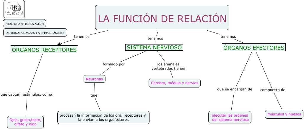 Este Cmap, tiene información relacionada con: Función de relación en los animales-5º, LA FUNCIÓN DE RELACIÓN tenemos ÓRGANOS EFECTORES, SISTEMA NERVIOSO formado por Neuronas, LA FUNCIÓN DE RELACIÓN tenemos SISTEMA NERVIOSO, ÓRGANOS RECEPTORES que captan estímulos, como: Ojos, gusto,tacto, olfato y oído, SISTEMA NERVIOSO los animales vertebrados tienen Cerebro, médula y nervios, ÓRGANOS EFECTORES que se encargan de ejecutar las órdenes del sistema nervioso, LA FUNCIÓN DE RELACIÓN tenemos ÓRGANOS RECEPTORES, Neuronas que procesan la información de los org. receptores y la envían a los org.efectores, ÓRGANOS EFECTORES compuesto de músculos y huesos