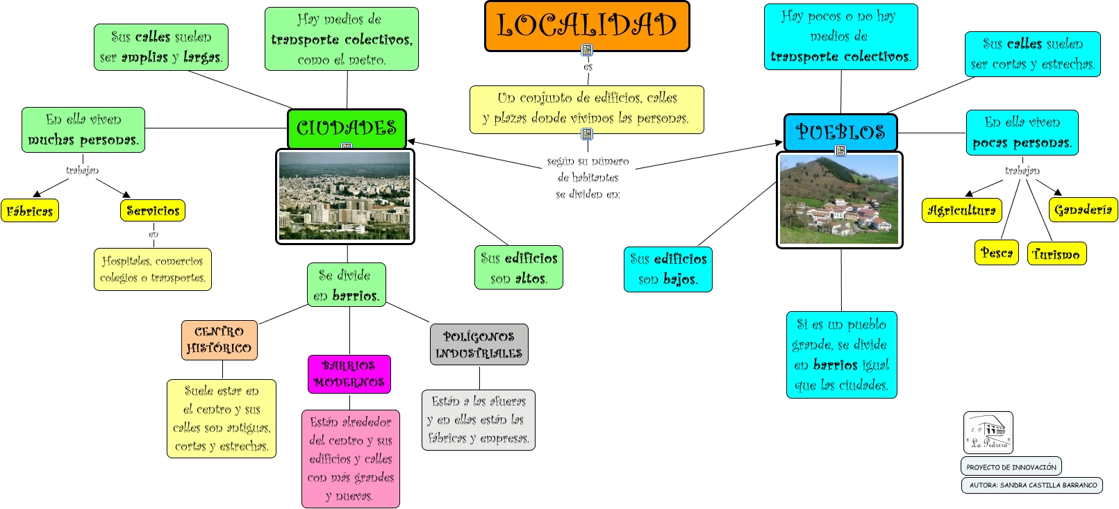 Este Cmap, tiene información relacionada con: PUEBLO Y CIUDAD, En ella viven muchas personas. trabajan Servicios, CIUDADES ???? Hay medios de transporte colectivos, como el metro., Servicios en Hospitales, comercios colegios o transportes., En ella viven pocas personas. trabajan Turismo, Sus edificios son bajos. ???? PUEBLOS, CENTRO HISTÓRICO ???? Se divide en barrios., PUEBLOS ???? Hay pocos o no hay medios de transporte colectivos., En ella viven pocas personas. trabajan Agricultura, CIUDADES ???? Sus calles suelen ser amplias y largas., CENTRO HISTÓRICO ???? Suele estar en el centro y sus calles son antiguas, cortas y estrechas., CIUDADES ???? Se divide en barrios., CIUDADES ???? En ella viven muchas personas., Un conjunto de edificios, calles y plazas donde vivimos las personas. según su número de habitantes se dividen en: PUEBLOS, PUEBLOS ???? Sus calles suelen ser cortas y estrechas., CIUDADES ????, POLÍGONOS INDUSTRIALES ???? Están a las afueras y en ellas están las fábricas y empresas., PUEBLOS ????, En ella viven pocas personas. trabajan Ganadería, BARRIOS MODERNOS ???? Están alrededor del centro y sus edificios y calles con más grandes y nuevas., Se divide en barrios. ???? BARRIOS MODERNOS