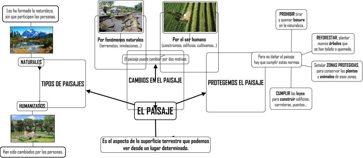 Este Cmap, tiene información relacionada con: ELEMENTOS DEL PAISAJE BLANCO, NATURALES Los ha formado la naturaleza, sin que participen las personas., EL PAISAJE CAMBIOS EN EL PAISAJE El paisaje puede cambiar por dos motivos, EL PAISAJE TIPOS DE PAISAJES NATURALES, El paisaje puede cambiar por dos motivos Por fenómenos naturales (terremotos, inindaciones...), EL PAISAJE TIPOS DE PAISAJES HUMANIZADOS, Para no dañar el paisaje hay que cumplir estas normas ???? PROHIBIR tirar y quemar basura en la naturaleza., Para no dañar el paisaje hay que cumplir estas normas ???? REFORESTAR, plantar nuevos árboles que se han talado o quemado., Para no dañar el paisaje hay que cumplir estas normas ???? CUMPLIR las leyes para construir edificios, carreteras, puentes..., El paisaje puede cambiar por dos motivos Por el ser humano (construimos, edificios, cultivamos...), HUMANIZADOS Han sido cambiados por las personas., EL PAISAJE Es el aspecto de la superficie terrestre que podemos ver desde un lugar determinado. Es el aspecto de la superficie terrestre que podemos ver desde un lugar determinado., EL PAISAJE PROTEGEMOS EL PAISAJE Para no dañar el paisaje hay que cumplir estas normas, Para no dañar el paisaje hay que cumplir estas normas ???? Señalar ZONAS PROTEGIDAS, para conservar las plantas y animales de esas zonas.