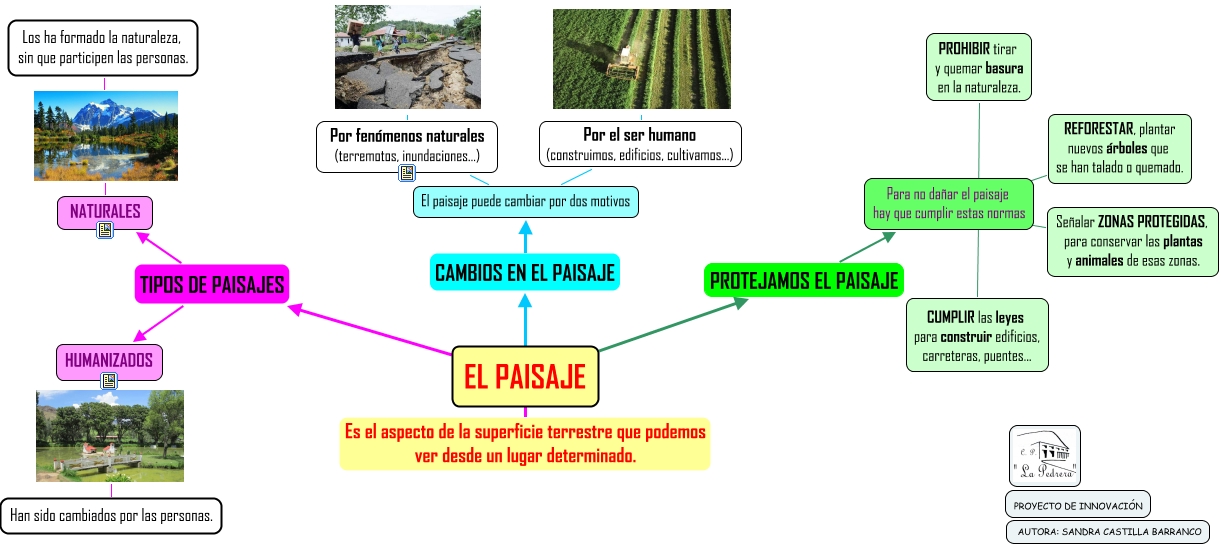 Este Cmap, tiene información relacionada con: ELEMENTOS DEL PAISAJE, EL PAISAJE PROTEJAMOS EL PAISAJE Para no dañar el paisaje hay que cumplir estas normas, El paisaje puede cambiar por dos motivos Por fenómenos naturales (terremotos, inundaciones...), Para no dañar el paisaje hay que cumplir estas normas ???? PROHIBIR tirar y quemar basura en la naturaleza., NATURALES Los ha formado la naturaleza, sin que participen las personas., Para no dañar el paisaje hay que cumplir estas normas ???? REFORESTAR, plantar nuevos árboles que se han talado o quemado., EL PAISAJE Es el aspecto de la superficie terrestre que podemos ver desde un lugar determinado. Es el aspecto de la superficie terrestre que podemos ver desde un lugar determinado., EL PAISAJE CAMBIOS EN EL PAISAJE El paisaje puede cambiar por dos motivos, EL PAISAJE TIPOS DE PAISAJES NATURALES, El paisaje puede cambiar por dos motivos Por el ser humano (construimos, edificios, cultivamos...), Para no dañar el paisaje hay que cumplir estas normas ???? Señalar ZONAS PROTEGIDAS, para conservar las plantas y animales de esas zonas., Para no dañar el paisaje hay que cumplir estas normas ???? CUMPLIR las leyes para construir edificios, carreteras, puentes..., HUMANIZADOS Han sido cambiados por las personas., EL PAISAJE TIPOS DE PAISAJES HUMANIZADOS