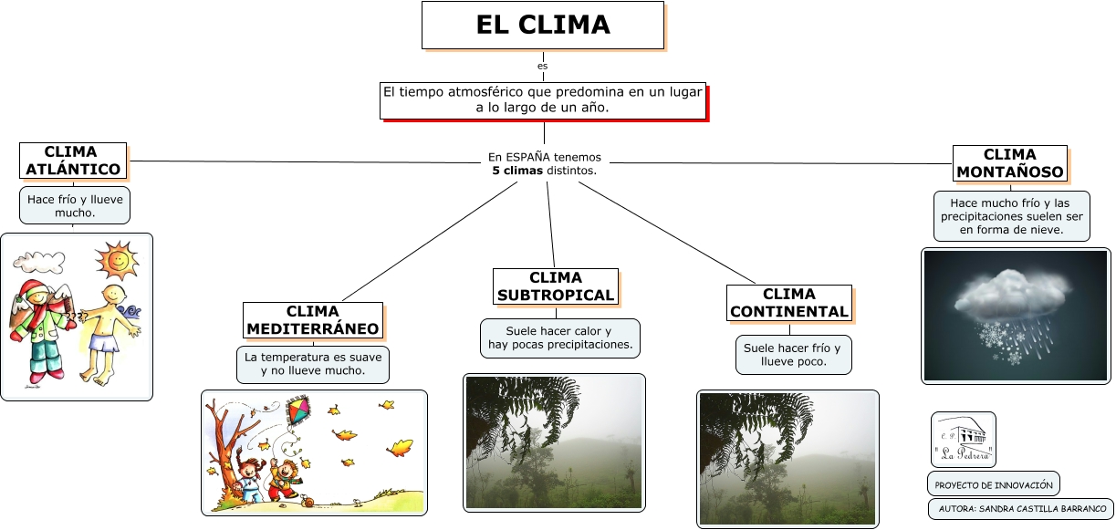 Este Cmap, tiene información relacionada con: EL CLIMA, EL CLIMA es El tiempo atmosférico que predomina en un lugar a lo largo de un año., El tiempo atmosférico que predomina en un lugar a lo largo de un año. En ESPAÑA tenemos 5 climas distintos. CLIMA ATLÁNTICO, El tiempo atmosférico que predomina en un lugar a lo largo de un año. En ESPAÑA tenemos 5 climas distintos. CLIMA MEDITERRÁNEO, CLIMA CONTINENTAL ???? Suele hacer frío y llueve poco., El tiempo atmosférico que predomina en un lugar a lo largo de un año. En ESPAÑA tenemos 5 climas distintos. CLIMA CONTINENTAL, CLIMA MONTAÑOSO ???? Hace mucho frío y las precipitaciones suelen ser en forma de nieve., El tiempo atmosférico que predomina en un lugar a lo largo de un año. En ESPAÑA tenemos 5 climas distintos. CLIMA MONTAÑOSO, CLIMA ATLÁNTICO Hace frío y llueve mucho., CLIMA MEDITERRÁNEO ???? La temperatura es suave y no llueve mucho., El tiempo atmosférico que predomina en un lugar a lo largo de un año. En ESPAÑA tenemos 5 climas distintos. CLIMA SUBTROPICAL, CLIMA SUBTROPICAL ???? Suele hacer calor y hay pocas precipitaciones.
