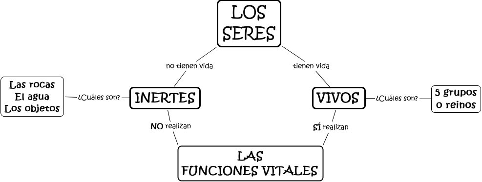 Este Cmap, tiene información relacionada con: seres vivos 3º, VIVOS S�? realizan LAS FUNCIONES VITALES, INERTES NO realizan LAS FUNCIONES VITALES, INERTES ¿Cuáles son? Las rocas El agua Los objetos, LOS SERES tienen vida VIVOS, VIVOS ¿Cuáles son? 5 grupos o reinos, LOS SERES no tienen vida INERTES