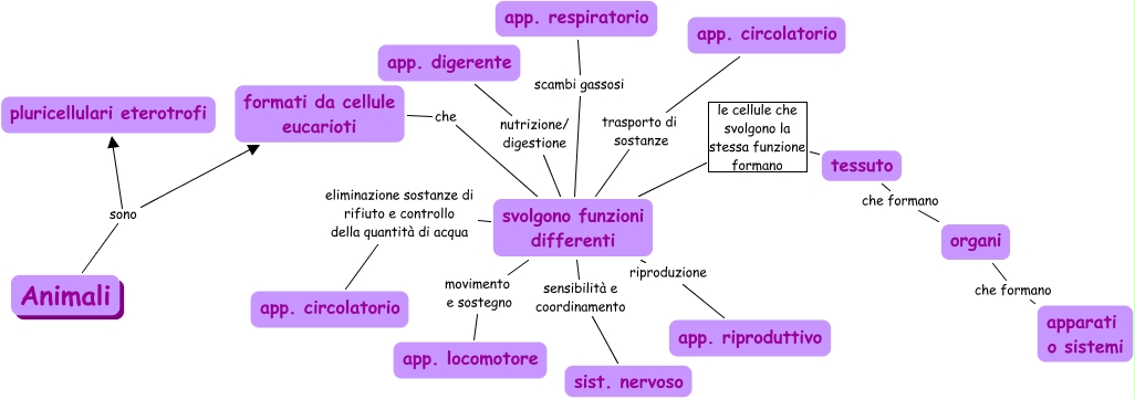 Questa Cmap, creata con IHMC CmapTools, contiene informazioni relative a: animali ù.ù, organi che formano apparati o sistemi, svolgono funzioni differenti trasporto di sostanze app. circolatorio, svolgono funzioni differenti scambi gassosi app. respiratorio, svolgono funzioni differenti eliminazione sostanze di rifiuto e controllo della quantità di acqua app. circolatorio, Animali sono pluricellulari eterotrofi, svolgono funzioni differenti le cellule che svolgono la stessa funzione formano tessuto, svolgono funzioni differenti riproduzione app. riproduttivo, tessuto che formano organi, Animali sono formati da cellule eucarioti, svolgono funzioni differenti nutrizione/ digestione app. digerente, svolgono funzioni differenti sensibilità e coordinamento sist. nervoso, formati da cellule eucarioti che svolgono funzioni differenti, svolgono funzioni differenti movimento e sostegno app. locomotore