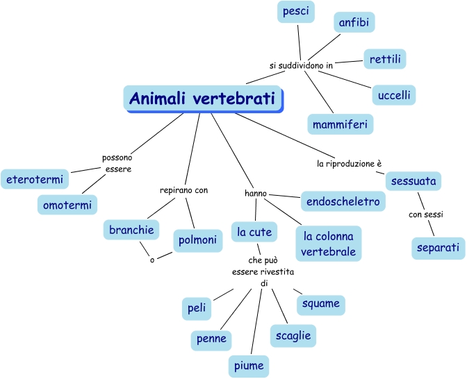 Questa Cmap, creata con IHMC CmapTools, contiene informazioni relative a: animali vertebrati, Animali vertebrati si suddividono in rettili, Animali vertebrati hanno la colonna vertebrale, la cute che può essere rivestita di penne, la cute che può essere rivestita di piume, Animali vertebrati hanno la cute, Animali vertebrati repirano con branchie, Animali vertebrati possono essere eterotermi, la cute che può essere rivestita di squame, Animali vertebrati si suddividono in anfibi, polmoni o branchie, Animali vertebrati la riproduzione è sessuata, sessuata con sessi separati, Animali vertebrati si suddividono in uccelli, Animali vertebrati repirano con polmoni, Animali vertebrati hanno endoscheletro, la cute che può essere rivestita di scaglie, la cute che può essere rivestita di peli, Animali vertebrati possono essere omotermi, Animali vertebrati si suddividono in pesci, Animali vertebrati si suddividono in mammiferi