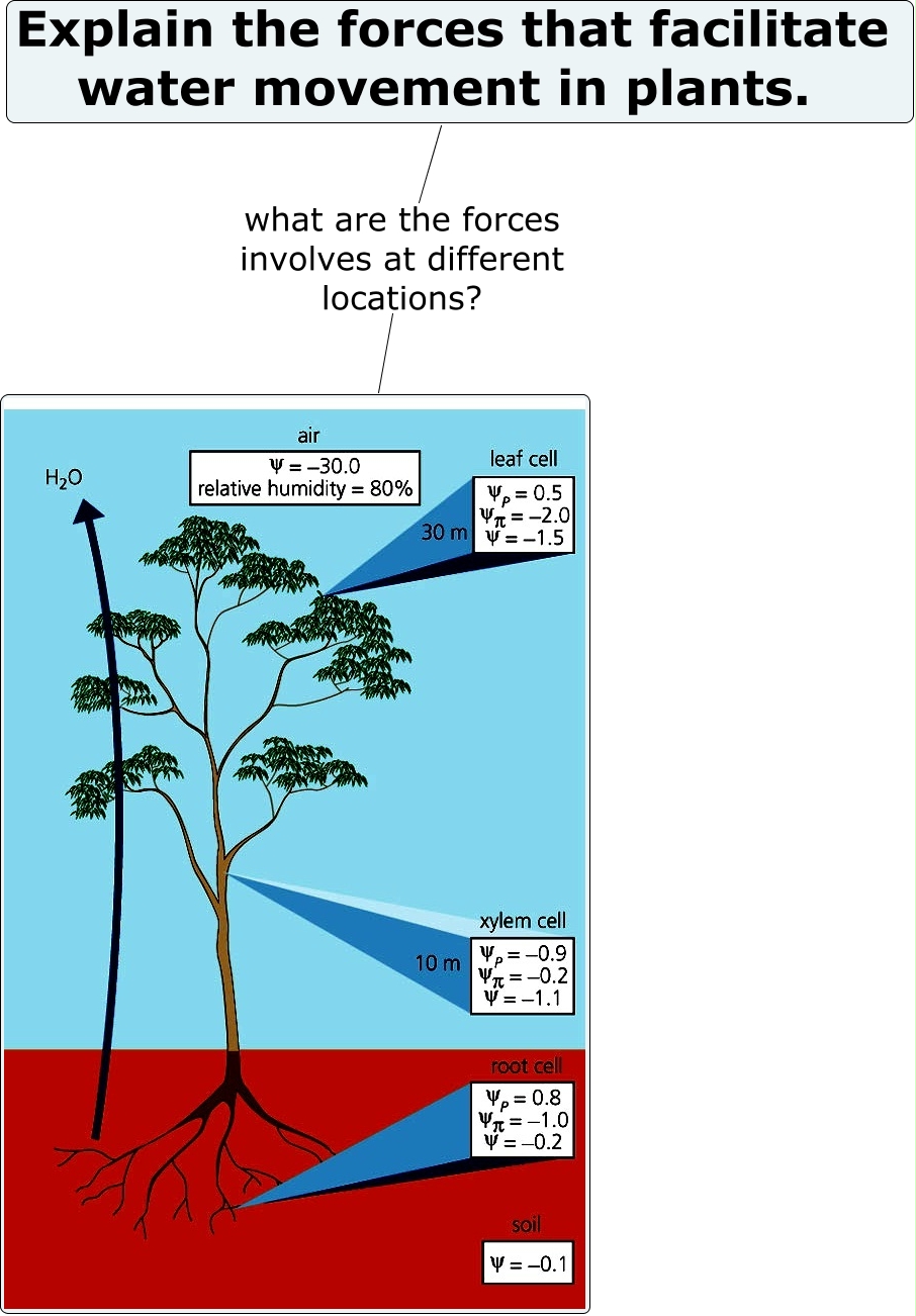 This Concept Map, created with IHMC CmapTools, has information related to: Forces facilitateTransport in Plants, Explain the forces that facilitate water movement in plants. what are the forces involves at different locations?