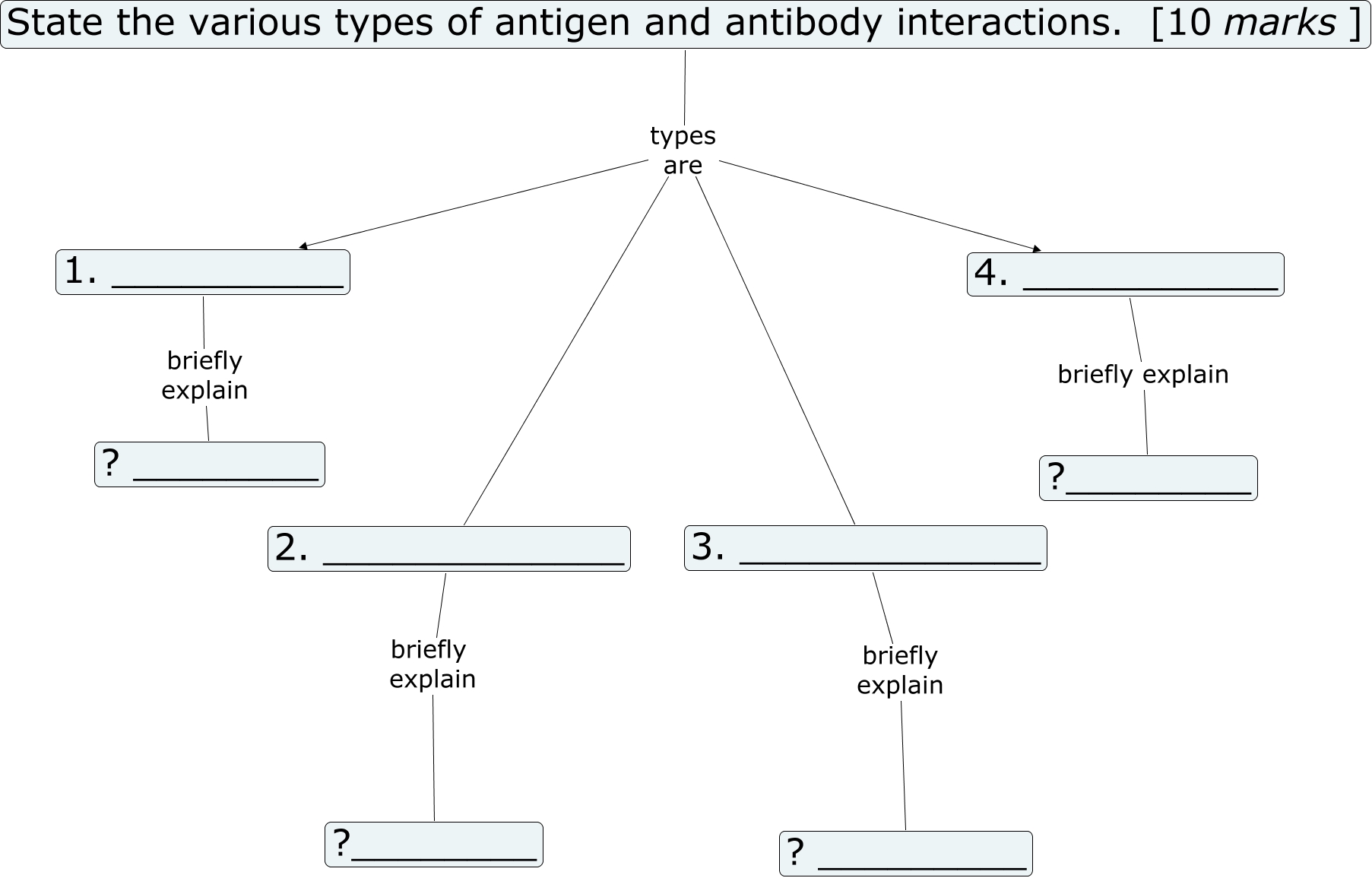 This Concept Map, created with IHMC CmapTools, has information related to: Types of antigen antibody interactions, 1. __________ briefly explain ? ________, State the various types of antigen and antibody interactions. [10 marks] types are 1. __________, 2. _____________ briefly explain ?________, 3. _____________ briefly explain ? _________, State the various types of antigen and antibody interactions. [10 marks] types are 2. _____________, State the various types of antigen and antibody interactions. [10 marks] types are 3. _____________, 4. ___________ briefly explain ?________, State the various types of antigen and antibody interactions. [10 marks] types are 4. ___________