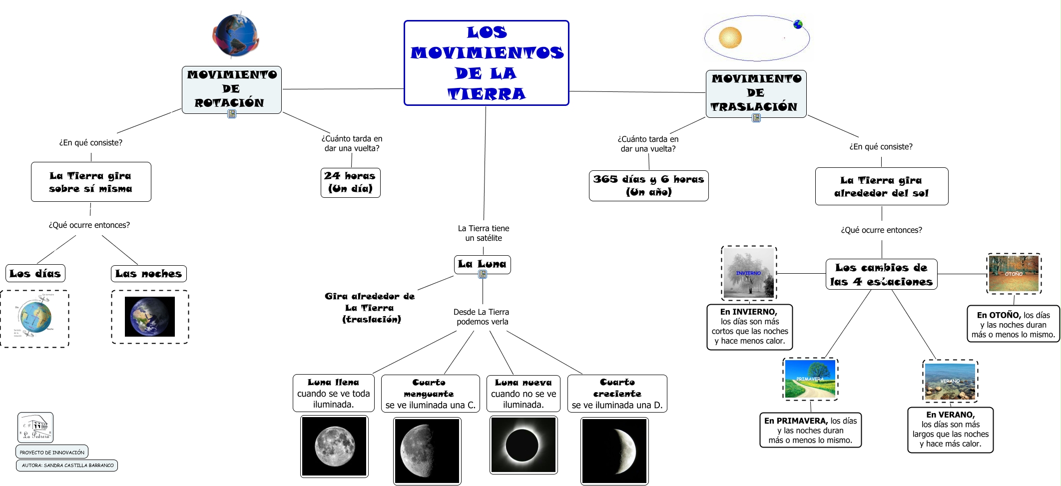 Este Cmap, tiene información relacionada con: LOS MOVIMIENTOS DE LA TIERRA, PRIMAVERA En PRIMAVERA, los días y las noches duran más o menos lo mismo., La Tierra gira sobre sí misma ¿Qué ocurre entonces? Las noches, La Luna Desde La Tierra podemos verla Luna nueva cuando no se ve iluminada., La Luna Desde La Tierra podemos verla Cuarto creciente se ve iluminada una D., OTOÑO En OTOÑO, los días y las noches duran más o menos lo mismo., La Luna Gira alrededor de La Tierra (traslación), La Tierra gira alrededor del sol ¿Qué ocurre entonces? Los cambios de las 4 estaciones, MOVIMIENTO DE ROTACIÓN ¿Cuánto tarda en dar una vuelta? 24 horas (Un día), MOVIMIENTO DE TRASLACIÓN ¿En qué consiste? La Tierra gira alrededor del sol, MOVIMIENTO DE ROTACIÓN ???? LOS MOVIMIENTOS DE LA TIERRA, MOVIMIENTO DE TRASLACIÓN ¿Cuánto tarda en dar una vuelta? 365 días y 6 horas (Un año), INVIERNO En INVIERNO, los días son más cortos que las noches y hace menos calor., La Tierra gira sobre sí misma ¿Qué ocurre entonces? Los días, VERANO En VERANO, los días son más largos que las noches y hace más calor., LOS MOVIMIENTOS DE LA TIERRA La Tierra tiene un satélite La Luna, MOVIMIENTO DE TRASLACIÓN ???? LOS MOVIMIENTOS DE LA TIERRA, La Luna Desde La Tierra podemos verla Luna llena cuando se ve toda iluminada., La Luna Desde La Tierra podemos verla Cuarto menguante se ve iluminada una C., MOVIMIENTO DE ROTACIÓN ¿En qué consiste? La Tierra gira sobre sí misma