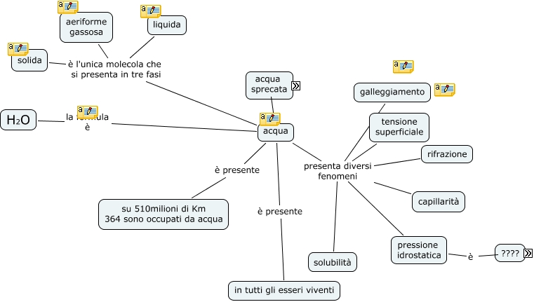 Questa Cmap, creata con IHMC CmapTools, contiene informazioni relative a: acqua, quella pressione esercitata da un liquido che è meno forte nei punti alti, acqua la formula è H2O, acqua presenta diversi fenomeni capillarità, acqua presenta diversi fenomeni solubilità, più forte nei punti bassi perchè più è alta la colonna di liquido più è forte pressione, pressione idrostatica è quella pressione esercitata da un liquido, acqua viene sprecata su 4000 Km 575 acqua che sulla terra in un anno, acqua presenta diversi fenomeni tensione superficiale, 40 flusso di acque continentali di cui 14 acqua disponibile di cui buona parte deve essere lasciata al suo corso, più è alta la colonna di liquido più è forte pressione questo è dimostrato col principio di PASCAL, acqua presenta diversi fenomeni rifrazione, 110 su superfici emerse di cui 40 flusso di acque continentali, acqua è l'unica molecola che si presenta in tre fasi aeriforme gassosa, acqua è presente in tutti gli esseri viventi, acqua è l'unica molecola che si presenta in tre fasi liquida, acqua presenta diversi fenomeni pressione idrostatica, 575 acqua che sulla terra in un anno di cui 465 sugli oceani, 575 acqua che sulla terra in un anno di cui 110 su superfici emerse, acqua presenta diversi fenomeni galleggiamento, meno forte nei punti alti perchè più è alta la colonna di liquido più è forte pressione