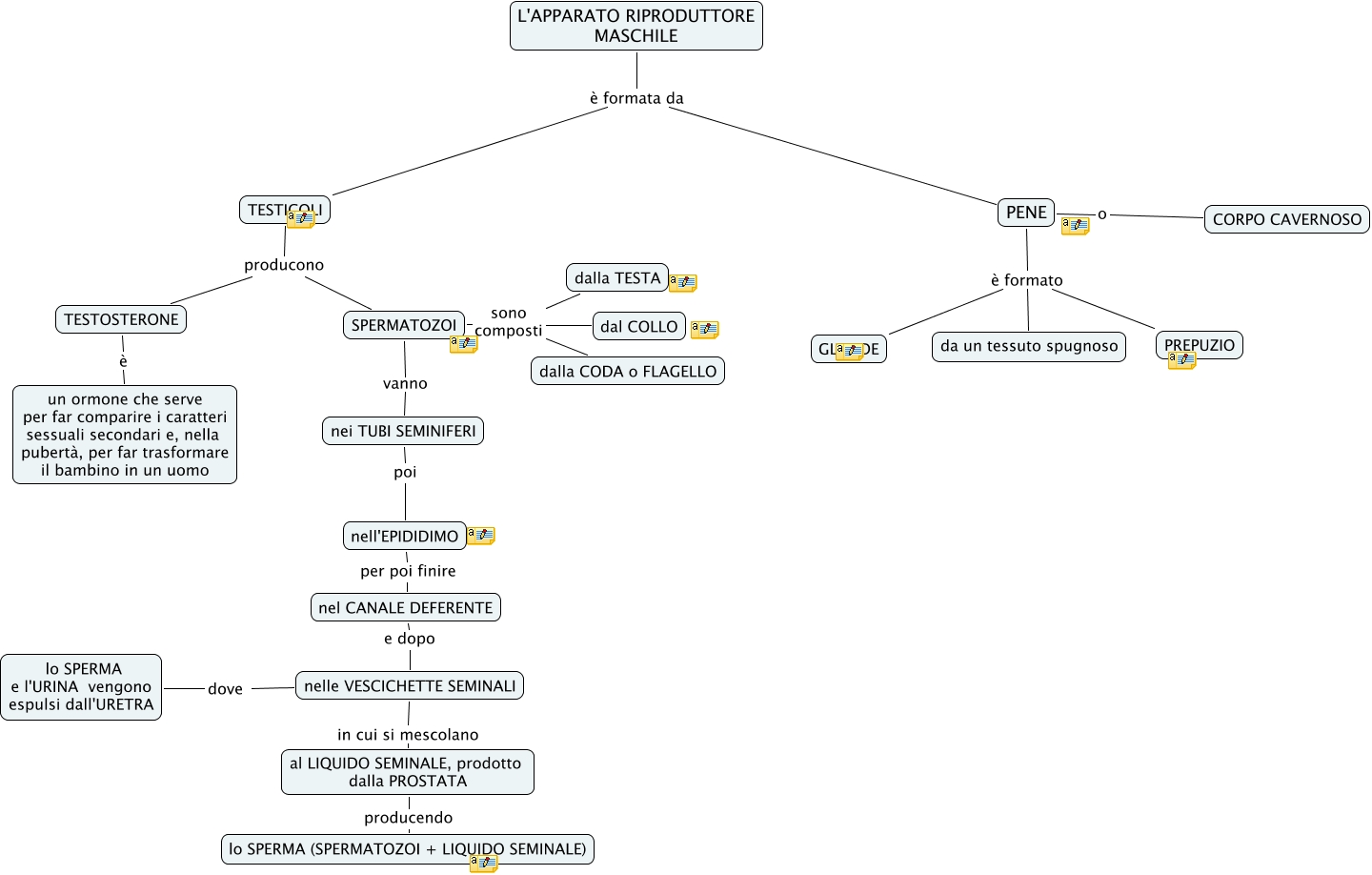 Questa Cmap, creata con IHMC CmapTools, contiene informazioni relative a: l-apparato-riproduttore-maschile, nelle VESCICHETTE SEMINALI dove lo SPERMA e l'URINA vengono espulsi dall'URETRA, PENE è formato PREPUZIO, PENE è formato GLANDE, TESTICOLI producono SPERMATOZOI, TESTOSTERONE è un ormone che serve per far comparire i caratteri sessuali secondari e, nella pubertà, per far trasformare il bambino in un uomo, SPERMATOZOI sono composti dalla TESTA, nelle VESCICHETTE SEMINALI in cui si mescolano al LIQUIDO SEMINALE, prodotto dalla PROSTATA, nell'EPIDIDIMO per poi finire nel CANALE DEFERENTE, SPERMATOZOI vanno nei TUBI SEMINIFERI, PENE o CORPO CAVERNOSO, SPERMATOZOI sono composti dal COLLO, nel CANALE DEFERENTE e dopo nelle VESCICHETTE SEMINALI, SPERMATOZOI sono composti dalla CODA o FLAGELLO, L'APPARATO RIPRODUTTORE MASCHILE è formata da TESTICOLI, TESTICOLI producono TESTOSTERONE, L'APPARATO RIPRODUTTORE MASCHILE è formata da PENE, nei TUBI SEMINIFERI poi nell'EPIDIDIMO, al LIQUIDO SEMINALE, prodotto dalla PROSTATA producendo lo SPERMA (SPERMATOZOI + LIQUIDO SEMINALE), PENE è formato da un tessuto spugnoso