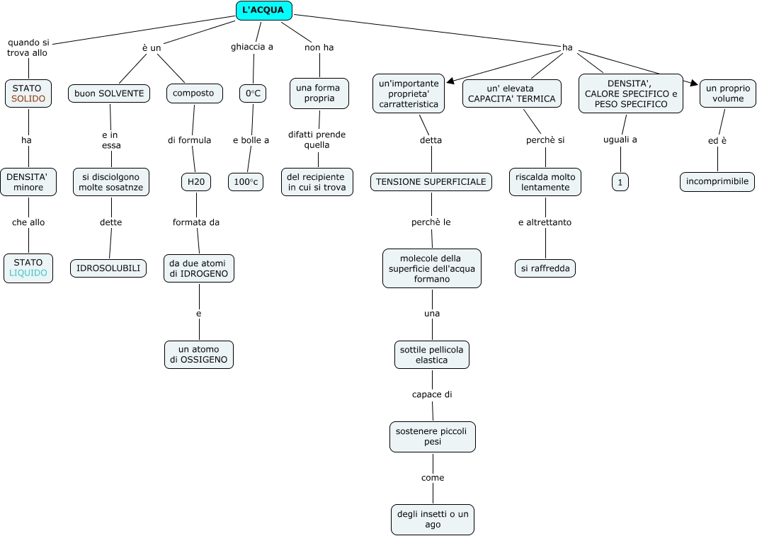 Questa Cmap, creata con IHMC CmapTools, contiene informazioni relative a: le proprieta' dell'acqua alessia rovoletto, sostenere piccoli pesi come degli insetti o un ago, H20 formata da da due atomi di IDROGENO, un'importante proprieta' carratteristica detta TENSIONE SUPERFICIALE, 0°C e bolle a 100°c, buon SOLVENTE e in essa si disciolgono molte sosatnze, L'ACQUA quando si trova allo STATO SOLIDO, una forma propria difatti prende quella del recipiente in cui si trova, sottile pellicola elastica capace di sostenere piccoli pesi, DENSITA', CALORE SPECIFICO e PESO SPECIFICO uguali a 1, si disciolgono molte sosatnze dette IDROSOLUBILI, molecole della superficie dell'acqua formano una sottile pellicola elastica, L'ACQUA è un composto, L'ACQUA ha DENSITA', CALORE SPECIFICO e PESO SPECIFICO, L'ACQUA è un buon SOLVENTE, un' elevata CAPACITA' TERMICA perchè si riscalda molto lentamente, TENSIONE SUPERFICIALE perchè le molecole della superficie dell'acqua formano, L'ACQUA ha un' elevata CAPACITA' TERMICA, DENSITA' minore che allo STATO LIQUIDO, composto di formula H20, L'ACQUA ha un'importante proprieta' carratteristica