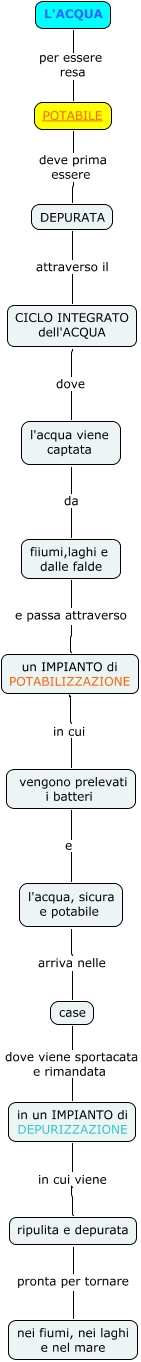 Questa Cmap, creata con IHMC CmapTools, contiene informazioni relative a: ciclo integrato dell'acqua alessia rovoletto, fiiumi,laghi e dalle falde e passa attraverso un IMPIANTO di POTABILIZZAZIONE, vengono prelevati i batteri e l'acqua, sicura e potabile, DEPURATA attraverso il CICLO INTEGRATO dell'ACQUA, in un IMPIANTO di DEPURIZZAZIONE in cui viene ripulita e depurata, POTABILE deve prima essere DEPURATA, l'acqua, sicura e potabile arriva nelle case, case dove viene sportacata e rimandata in un IMPIANTO di DEPURIZZAZIONE, CICLO INTEGRATO dell'ACQUA dove l'acqua viene captata, un IMPIANTO di POTABILIZZAZIONE in cui vengono prelevati i batteri, ripulita e depurata pronta per tornare nei fiumi, nei laghi e nel mare, l'acqua viene captata da fiiumi,laghi e dalle falde, L'ACQUA per essere resa POTABILE