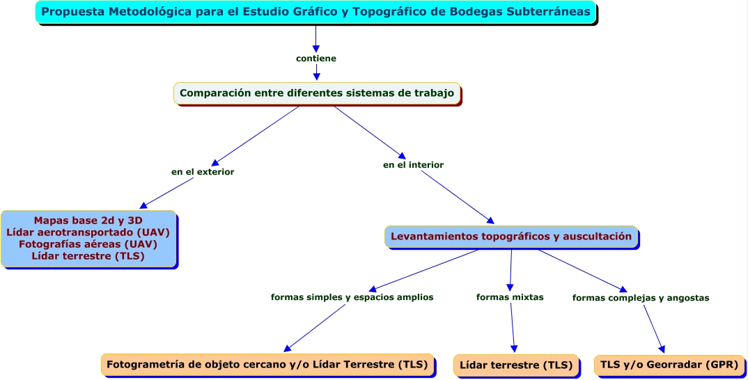 Este Cmap, tiene información relacionada con: Comparación entre Sistemas (Bodegas), Comparación entre diferentes sistemas de trabajo en el exterior Mapas base 2d y 3D Lídar aerotransportado (UAV) Fotografías aéreas (UAV) Lídar terrestre (TLS), Propuesta Metodológica para el Estudio Gráfico y Topográfico de Bodegas Subterráneas contiene Comparación entre diferentes sistemas de trabajo, Levantamientos topográficos y auscultación formas complejas y angostas TLS y/o Georradar (GPR), Levantamientos topográficos y auscultación formas simples y espacios amplios Fotogrametría de objeto cercano y/o Lídar Terrestre (TLS), Levantamientos topográficos y auscultación formas mixtas Lídar terrestre (TLS), Comparación entre diferentes sistemas de trabajo en el interior Levantamientos topográficos y auscultación