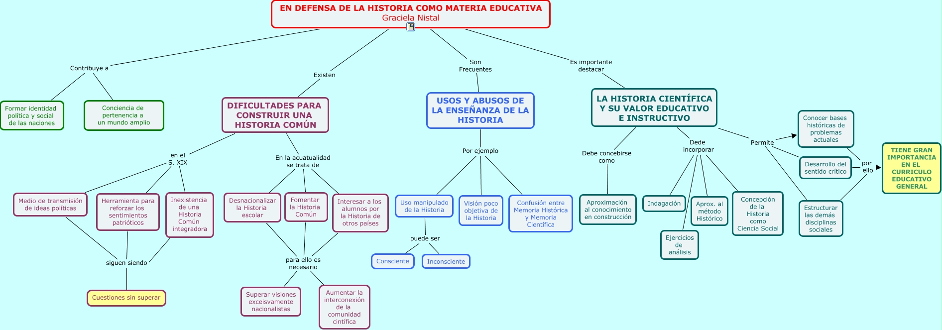 Este Cmap, tiene información relacionada con: HISTORIA COMO MATERIAL EDUCATIVO, Uso manipulado de la Historia puede ser Consciente, LA HISTORIA CIENTÍFICA Y SU VALOR EDUCATIVO E INSTRUCTIVO Dede incorporar Ejercicios de análisis, EN DEFENSA DE LA HISTORIA COMO MATERIA EDUCATIVA Graciela Nistal Es importante destacar LA HISTORIA CIENTÍFICA Y SU VALOR EDUCATIVO E INSTRUCTIVO, Desarrollo del sentido crítico por ello TIENE GRAN IMPORTANCIA EN EL CURRICULO EDUCATIVO GENERAL, DIFICULTADES PARA CONSTRUIR UNA HISTORIA COMÚN en el S. XIX Herramienta para reforzar los sentimientos patrióticos, LA HISTORIA CIENTÍFICA Y SU VALOR EDUCATIVO E INSTRUCTIVO Permite Estructurar las demás disciplinas sociales, Fomentar la Historia Común para ello es necesario Aumentar la interconexión de la comunidad cintífica, USOS Y ABUSOS DE LA ENSEÑANZA DE LA HISTORIA Por ejemplo Confusión entre Memoria Histórica y Memoria Científica, Interesar a los alumnos por la Historia de otros países para ello es necesario Aumentar la interconexión de la comunidad cintífica, LA HISTORIA CIENTÍFICA Y SU VALOR EDUCATIVO E INSTRUCTIVO Debe concebirse como Aproximación al conocimiento en construcción, EN DEFENSA DE LA HISTORIA COMO MATERIA EDUCATIVA Graciela Nistal Existen DIFICULTADES PARA CONSTRUIR UNA HISTORIA COMÚN, LA HISTORIA CIENTÍFICA Y SU VALOR EDUCATIVO E INSTRUCTIVO Dede incorporar Indagación, DIFICULTADES PARA CONSTRUIR UNA HISTORIA COMÚN en el S. XIX Medio de transmisión de ideas políticas, DIFICULTADES PARA CONSTRUIR UNA HISTORIA COMÚN En la acuatualidad se trata de Fomentar la Historia Común, EN DEFENSA DE LA HISTORIA COMO MATERIA EDUCATIVA Graciela Nistal Contribuye a Formar identidad política y social de las naciones, Medio de transmisión de ideas políticas siguen siendo Cuestiones sin superar, DIFICULTADES PARA CONSTRUIR UNA HISTORIA COMÚN En la acuatualidad se trata de Interesar a los alumnos por la Historia de otros países, LA HISTORIA CIENTÍFICA Y SU VALOR EDUCATIVO E INSTRUCTIVO Permite Conocer bases históricas de problemas actuales, Interesar a los alumnos por la Historia de otros países para ello es necesario Superar visiones exceisvamente nacionalistas, DIFICULTADES PARA CONSTRUIR UNA HISTORIA COMÚN en el S. XIX Inexistencia de una Historia Común integradora
