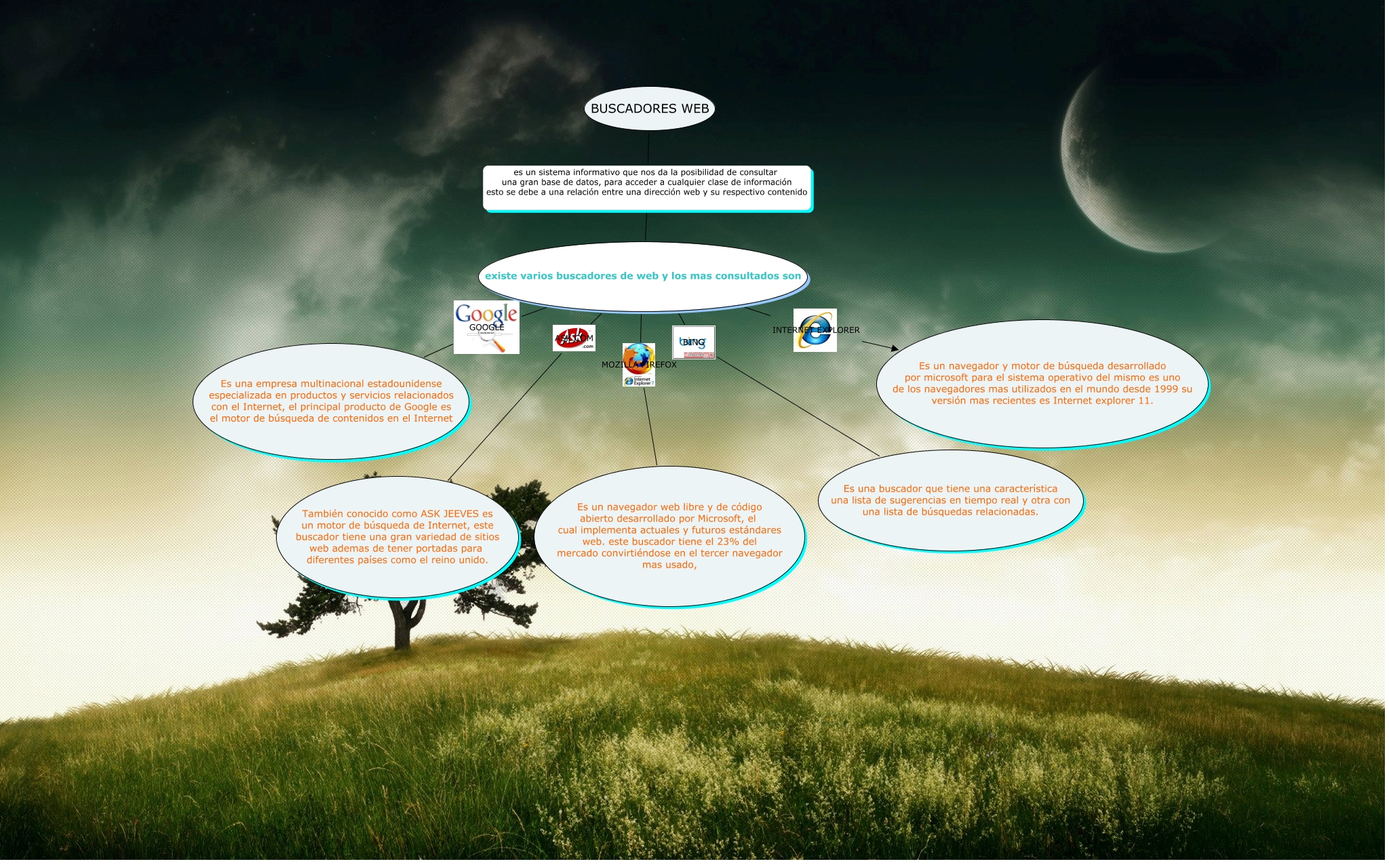 Este Cmap, tiene información relacionada con: buscadores de web, BUSCADORES WEB es un sistema informativo que nos da la posibilidad de consultar una gran base de datos, para acceder a cualquier clase de información esto se debe a una relación entre una dirección web y su respectivo contenido existe varios buscadores de web y los mas consultados son, existe varios buscadores de web y los mas consultados son GOOGLE Es una empresa multinacional estadounidense especializada en productos y servicios relacionados con el Internet, el principal producto de Google es el motor de búsqueda de contenidos en el Internet, existe varios buscadores de web y los mas consultados son MOZILLA FIREFOX Es un navegador web libre y de código abierto desarrollado por Microsoft, el cual implementa actuales y futuros estándares web. este buscador tiene el 23% del mercado convirtiéndose en el tercer navegador mas usado,, ???? BING Es una buscador que tiene una característica una lista de sugerencias en tiempo real y otra con una lista de búsquedas relacionadas., existe varios buscadores de web y los mas consultados son ASK.COM También conocido como ASK JEEVES es un motor de búsqueda de Internet, este buscador tiene una gran variedad de sitios web ademas de tener portadas para diferentes países como el reino unido., ???? INTERNET EXPLORER Es un navegador y motor de búsqueda desarrollado por microsoft para el sistema operativo del mismo es uno de los navegadores mas utilizados en el mundo desde 1999 su versión mas recientes es Internet explorer 11.