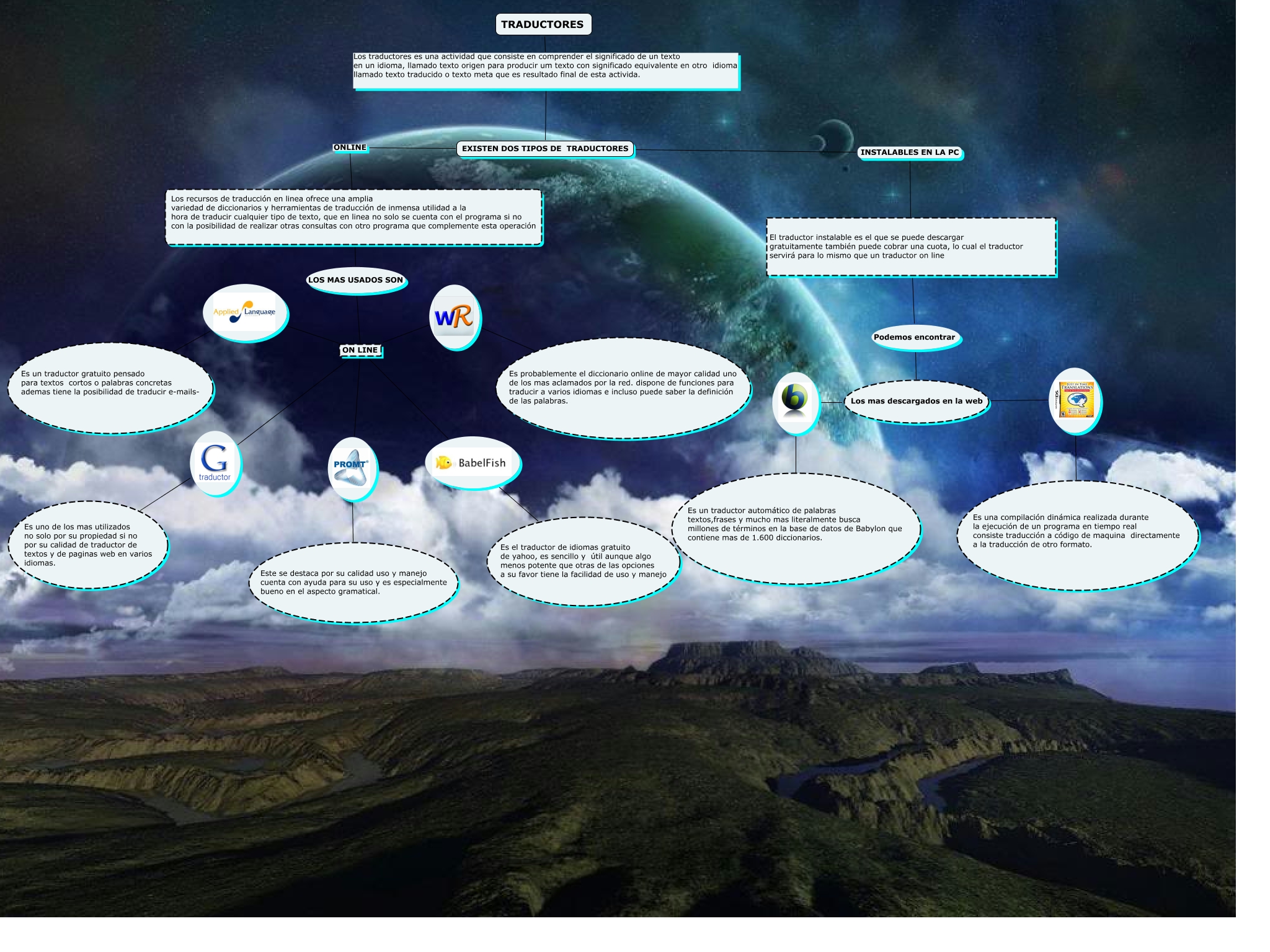 Este Cmap, tiene información relacionada con: traductores web, ON LINE Es el traductor de idiomas gratuito de yahoo, es sencillo y útil aunque algo menos potente que otras de las opciones a su favor tiene la facilidad de uso y manejo, Los mas descargados en la web Es un traductor automático de palabras textos,frases y mucho mas literalmente busca millones de términos en la base de datos de Babylon que contiene mas de 1.600 diccionarios., TRADUCTORES Los traductores es una actividad que consiste en comprender el significado de un texto en un idioma, llamado texto origen para producir um texto con significado equivalente en otro idioma llamado texto traducido o texto meta que es resultado final de esta activida. EXISTEN DOS TIPOS DE TRADUCTORES, EXISTEN DOS TIPOS DE TRADUCTORES ONLINE Los recursos de traducción en linea ofrece una amplia variedad de diccionarios y herramientas de traducción de inmensa utilidad a la hora de traducir cualquier tipo de texto, que en linea no solo se cuenta con el programa si no con la posibilidad de realizar otras consultas con otro programa que complemente esta operación, EXISTEN DOS TIPOS DE TRADUCTORES INSTALABLES EN LA PC El traductor instalable es el que se puede descargar gratuitamente también puede cobrar una cuota, lo cual el traductor servirá para lo mismo que un traductor on line, ON LINE Este se destaca por su calidad uso y manejo cuenta con ayuda para su uso y es especialmente bueno en el aspecto gramatical., ON LINE Es probablemente el diccionario online de mayor calidad uno de los mas aclamados por la red. dispone de funciones para traducir a varios idiomas e incluso puede saber la definición de las palabras., ON LINE Es un traductor gratuito pensado para textos cortos o palabras concretas ademas tiene la posibilidad de traducir e-mails-, ON LINE Es uno de los mas utilizados no solo por su propiedad si no por su calidad de traductor de textos y de paginas web en varios idiomas., El traductor instalable es el que se puede descargar gratuitamente también puede cobrar una cuota, lo cual el traductor servirá para lo mismo que un traductor on line Podemos encontrar Los mas descargados en la web, Los mas descargados en la web Es una compilación dinámica realizada durante la ejecución de un programa en tiempo real consiste traducción a código de maquina directamente a la traducción de otro formato., Los recursos de traducción en linea ofrece una amplia variedad de diccionarios y herramientas de traducción de inmensa utilidad a la hora de traducir cualquier tipo de texto, que en linea no solo se cuenta con el programa si no con la posibilidad de realizar otras consultas con otro programa que complemente esta operación LOS MAS USADOS SON ON LINE