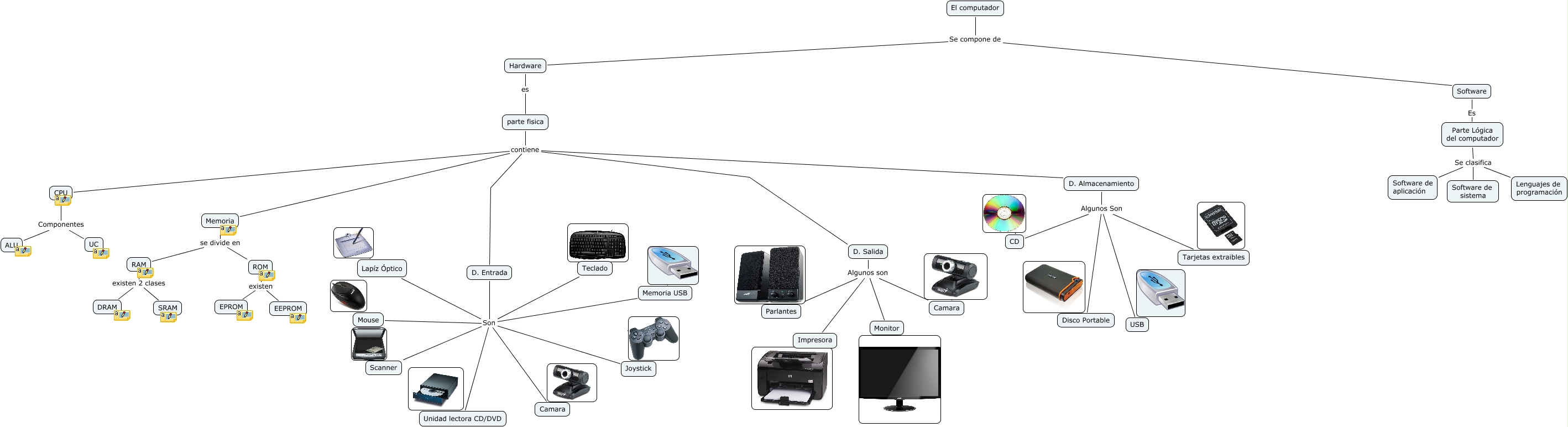 Este Cmap, tiene información relacionada con: PC-Andres David Torres Torres.cmap, CPU Componentes UC, Teclado ????, USB ????, D. Almacenamiento Algunos Son Disco Portable, Monitor ????, Memoria se divide en ROM, D. Salida Algunos son Camara, D. Entrada Son Joystick, RAM existen 2 clases DRAM, D. Entrada Son Mouse, Unidad lectora CD/DVD ????, Lapíz Óptico ????, D. Salida Algunos son Impresora, Hardware es parte fisica, Parte Lógica del computador Se clasifica Lenguajes de programación, CPU Componentes ALU, Tarjetas extraibles ????, Parte Lógica del computador Se clasifica Software de sistema, D. Almacenamiento Algunos Son Tarjetas extraibles, D. Entrada Son Scanner