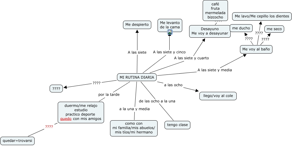 Questa Cmap, creata con IHMC CmapTools, contiene informazioni relative a: Mi rutina diaria, MI RUTINA DIARIA A las siete y cinco Me levanto de la cama, MI RUTINA DIARIA A las siete y media Me voy al baño, MI RUTINA DIARIA A las siete y cuarto Desayuno Me voy a desayunar, MI RUTINA DIARIA de las ocho a la una tengo clase, MI RUTINA DIARIA a las ocho llego/voy al cole, Me voy al baño ???? Me lavo/Me cepillo los dientes, duermo/me relajo estudio practico deporte quedo con mis amigos ???? quedar=trovarsi, MI RUTINA DIARIA por la tarde duermo/me relajo estudio practico deporte quedo con mis amigos, Me voy al baño ???? me seco, MI RUTINA DIARIA A las siete Me despierto, Desayuno Me voy a desayunar ???? café fruta mermelada bizcocho, MI RUTINA DIARIA a la una y media como con mi familia/mis abuelos/ mis tíos/mi hermano, MI RUTINA DIARIA ???? ????, Me voy al baño ???? me ducho