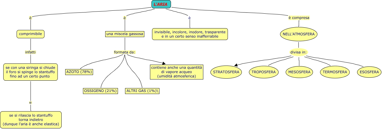 Questa Cmap, creata con IHMC CmapTools, contiene informazioni relative a: L'ARIA, una miscela gassosa formata da: AZOTO (78%), una miscela gassosa formata da: contiene anche una quantità di vapore acqueo (umidità atmosferica), comprimibile infatti se con una siringa si chiude il foro si spinge lo stantuffo fino ad un certo punto, NELL'ATMOSFERA divisa in: TERMOSFERA, NELL'ATMOSFERA divisa in: MESOSFERA, NELL'ATMOSFERA divisa in: ESOSFERA, L'ARIA è invisibile, incolore, inodore, trasparente e in un certo senso inafferrabile, una miscela gassosa formata da: ALTRI GAS (1%)\, NELL'ATMOSFERA divisa in: STRATOSFERA, L'ARIA è una miscela gassosa, L'ARIA è compresa NELL'ATMOSFERA, L'ARIA è comprimibile, se con una siringa si chiude il foro si spinge lo stantuffo fino ad un certo punto e se si rilascia lo stantuffo torna indietro (dunque l'aria è anche elastica), una miscela gassosa formata da: OSSIGENO (21%), NELL'ATMOSFERA divisa in: TROPOSFERA