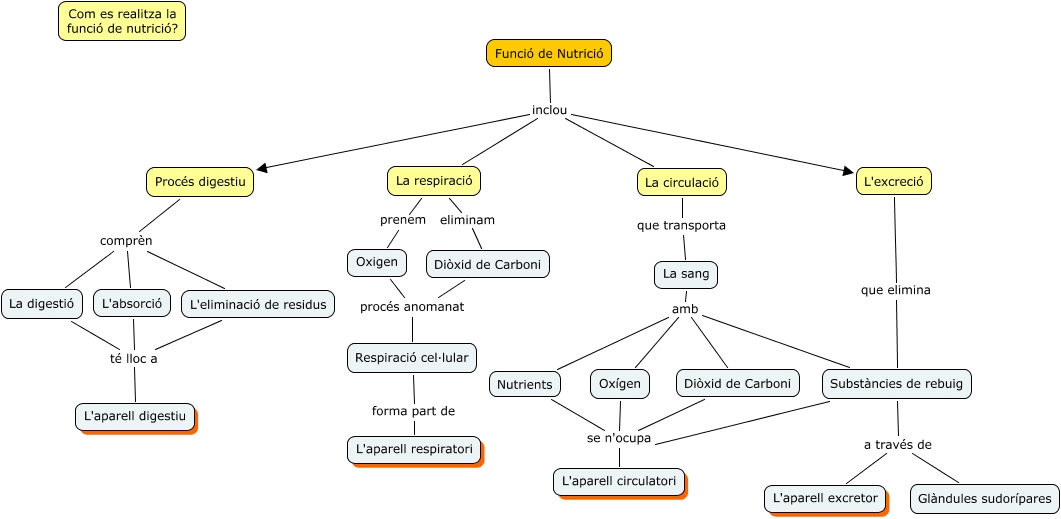 Este Cmap, tiene información relacionada con: CURS CMAPTOOLS MAIG 2014, La sang amb Substàncies de rebuig, Procés digestiu comprèn L'absorció, Substàncies de rebuig a través de Glàndules sudorípares, La respiració eliminam Diòxid de Carboni, L'excreció que elimina Substàncies de rebuig, La respiració prenem Oxigen, Funció de Nutrició inclou La respiració, Diòxid de Carboni se n'ocupa L'aparell circulatori, Funció de Nutrició inclou Procés digestiu, Oxigen procés anomanat Respiració cel·lular, Diòxid de Carboni procés anomanat Respiració cel·lular, Substàncies de rebuig a través de L'aparell excretor, La sang amb Nutrients, La digestió té lloc a L'aparell digestiu, Respiració cel·lular forma part de L'aparell respiratori, Oxígen se n'ocupa L'aparell circulatori, Substàncies de rebuig se n'ocupa L'aparell circulatori, L'absorció té lloc a L'aparell digestiu, La sang amb Diòxid de Carboni, Nutrients se n'ocupa L'aparell circulatori