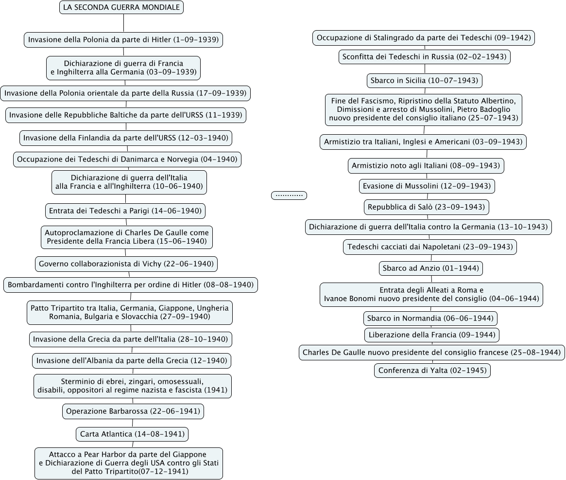 Questa Cmap, creata con IHMC CmapTools, contiene informazioni relative a: la-seconda-guerra-mondiale, Sterminio di ebrei, zingari, omosessuali, disabili, oppositori al regime nazista e fascista (1941) ???? Operazione Barbarossa (22-06-1941), LA SECONDA GUERRA MONDIALE ???? Invasione della Polonia da parte di Hitler (1-09-1939), Sbarco ad Anzio (01-1944) ???? Entrata degli Alleati a Roma e Ivanoe Bonomi nuovo presidente del consiglio (04-06-1944), Liberazione della Francia (09-1944) ???? Charles De Gaulle nuovo presidente del consiglio francese (25-08-1944), Invasione della Polonia da parte di Hitler (1-09-1939) ???? Dichiarazione di guerra di Francia e Inghilterra alla Germania (03-09-1939), Sconfitta dei Tedeschi in Russia (02-02-1943) ???? Sbarco in Sicilia (10-07-1943), Charles De Gaulle nuovo presidente del consiglio francese (25-08-1944) ???? Conferenza di Yalta (02-1945), Fine del Fascismo, Ripristino della Statuto Albertino, Dimissioni e arresto di Mussolini, Pietro Badoglio nuovo presidente del consiglio italiano (25-07-1943) ???? Armistizio tra Italiani, Inglesi e Americani (03-09-1943), Entrata dei Tedeschi a Parigi (14-06-1940) ???? Autoproclamazione di Charles De Gaulle come Presidente della Francia Libera (15-06-1940), Bombardamenti contro l'Inghilterra per ordine di Hitler (08-08-1940) ???? Patto Tripartito tra Italia, Germania, Giappone, Ungheria Romania, Bulgaria e Slovacchia (27-09-1940), Invasione delle Repubbliche Baltiche da parte dell'URSS (11-1939) ???? Invasione della Finlandia da parte dell'URSS (12-03-1940), Armistizio noto agli Italiani (08-09-1943) ???? Evasione di Mussolini (12-09-1943), Repubblica di Salò (23-09-1943) ???? Dichiarazione di guerra dell'Italia contro la Germania (13-10-1943), Governo collaborazionista di Vichy (22-06-1940) ???? Bombardamenti contro l'Inghilterra per ordine di Hitler (08-08-1940), Entrata degli Alleati a Roma e Ivanoe Bonomi nuovo presidente del consiglio (04-06-1944) ???? Sbarco in Normandia (06-06-1944), Dichiarazione di guerra dell'Italia alla Francia e all'Inghilterra (10-06-1940) ???? Entrata dei Tedeschi a Parigi (14-06-1940), Dichiarazione di guerra dell'Italia contro la Germania (13-10-1943) ???? Tedeschi cacciati dai Napoletani (23-09-1943), Armistizio tra Italiani, Inglesi e Americani (03-09-1943) ???? Armistizio noto agli Italiani (08-09-1943), Sbarco in Normandia (06-06-1944) ???? Liberazione della Francia (09-1944), Occupazione di Stalingrado da parte dei Tedeschi (09-1942) ???? Sconfitta dei Tedeschi in Russia (02-02-1943)