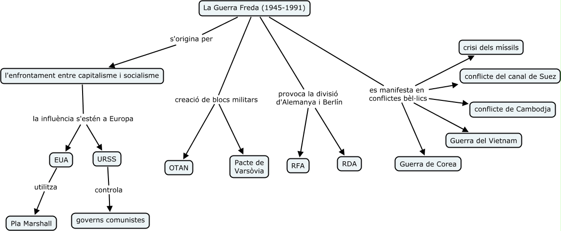 Este Cmap, tiene información relacionada con: La guerra freda, La Guerra Freda (1945-1991) provoca la divisió d'Alemanya i Berlín RDA, La Guerra Freda (1945-1991) creació de blocs militars Pacte de Varsòvia, l'enfrontament entre capitalisme i socialisme la influència s'estén a Europa URSS, l'enfrontament entre capitalisme i socialisme la influència s'estén a Europa EUA, La Guerra Freda (1945-1991) provoca la divisió d'Alemanya i Berlín RFA, La Guerra Freda (1945-1991) es manifesta en conflictes bèl·lics crisi dels míssils, URSS controla governs comunistes, La Guerra Freda (1945-1991) es manifesta en conflictes bèl·lics conflicte del canal de Suez, La Guerra Freda (1945-1991) s'origina per l'enfrontament entre capitalisme i socialisme, La Guerra Freda (1945-1991) es manifesta en conflictes bèl·lics Guerra de Corea, La Guerra Freda (1945-1991) es manifesta en conflictes bèl·lics conflicte de Cambodja, La Guerra Freda (1945-1991) es manifesta en conflictes bèl·lics Guerra del Vietnam, EUA utilitza Pla Marshall, La Guerra Freda (1945-1991) creació de blocs militars OTAN