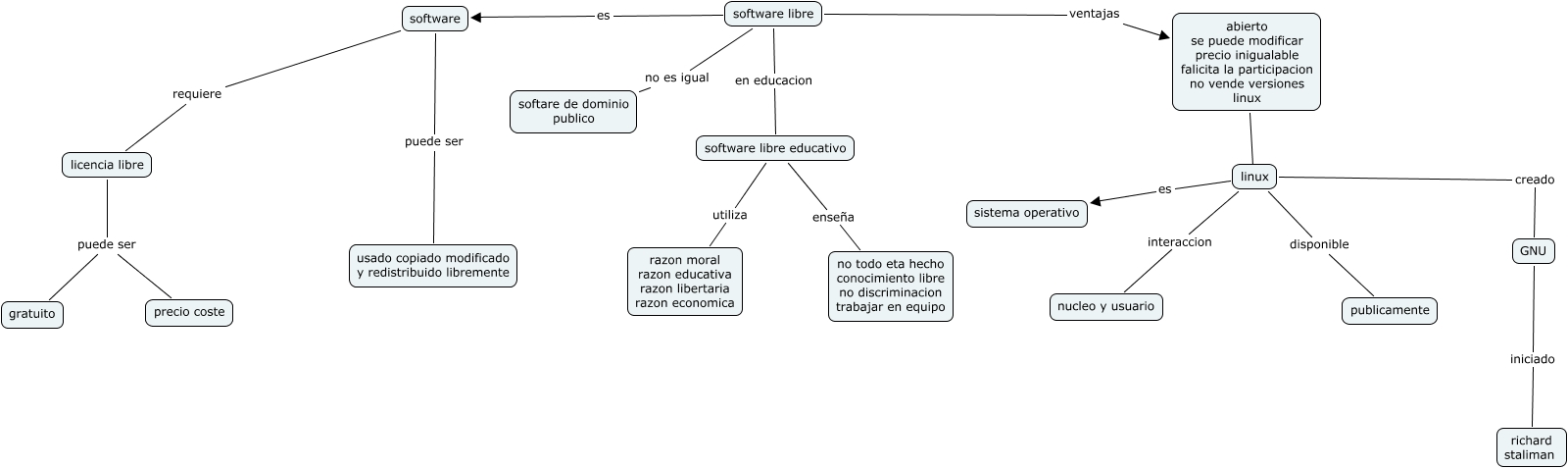 Este Cmap, tiene información relacionada con: Sin Título 1, software libre no es igual softare de dominio publico, software requiere licencia libre, software libre ventajas abierto se puede modificar precio inigualable falicita la participacion no vende versiones linux, software puede ser usado copiado modificado y redistribuido libremente, abierto se puede modificar precio inigualable falicita la participacion no vende versiones linux linux linux, linux interaccion nucleo y usuario, linux es sistema operativo, linux disponible publicamente, GNU iniciado richard staliman, software libre es software, linux creado GNU, licencia libre puede ser precio coste, software libre educativo utiliza razon moral razon educativa razon libertaria razon economica, licencia libre puede ser gratuito, software libre en educacion software libre educativo, software libre educativo enseña no todo eta hecho conocimiento libre no discriminacion trabajar en equipo
