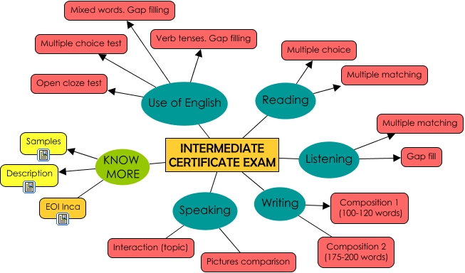 Este Cmap, tiene información relacionada con: ElisabetPrim_CertificateExam, INTERMEDIATE CERTIFICATE EXAM Reading Multiple choice, INTERMEDIATE CERTIFICATE EXAM Reading Multiple matching, INTERMEDIATE CERTIFICATE EXAM Speaking Pictures comparison, INTERMEDIATE CERTIFICATE EXAM Use of English Mixed words. Gap filling, INTERMEDIATE CERTIFICATE EXAM Use of English Open cloze test, INTERMEDIATE CERTIFICATE EXAM Use of English Verb tenses. Gap filling, INTERMEDIATE CERTIFICATE EXAM KNOW MORE Samples, INTERMEDIATE CERTIFICATE EXAM KNOW MORE EOI Inca, INTERMEDIATE CERTIFICATE EXAM Writing Composition 1 (100-120 words), INTERMEDIATE CERTIFICATE EXAM Listening Gap fill, INTERMEDIATE CERTIFICATE EXAM KNOW MORE Description, INTERMEDIATE CERTIFICATE EXAM Writing Composition 2 (175-200 words), INTERMEDIATE CERTIFICATE EXAM Use of English Multiple choice test, INTERMEDIATE CERTIFICATE EXAM Speaking Interaction (topic), INTERMEDIATE CERTIFICATE EXAM Listening Multiple matching