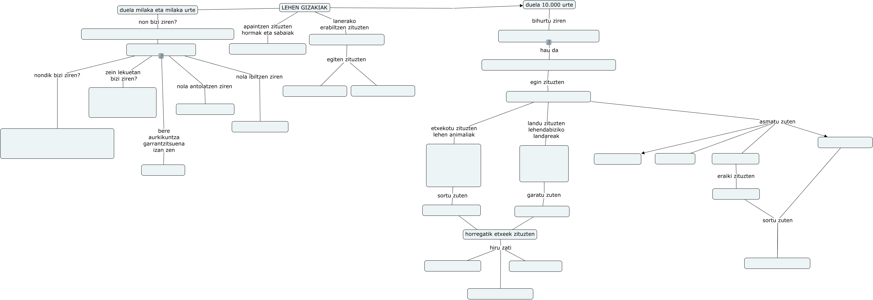IHMC CmapTools-ekin sortu den kontzeptu-mapa honek honi buruzko informazioa du: Lehen Gizakiak (Zuria), sortu zuten, LEHEN GIZAKIAK apaintzen zituzten hormak eta sabaiak, nola antolatzen ziren, asmatu zuten, eraiki zituzten, sortu zuten, garatu zuten, sortu zuten, zein lekuetan bizi ziren?, asmatu zuten, ????, egiten zituzten, horregatik etxeek zituzten hiru zati, duela 10.000 urte bihurtu ziren, LEHEN GIZAKIAK ???? duela milaka eta milaka urte, asmatu zuten, hau da, etxekotu zituzten lehen animaliak, nola ibiltzen ziren, bere aurkikuntza garrantzitsuena izan zen