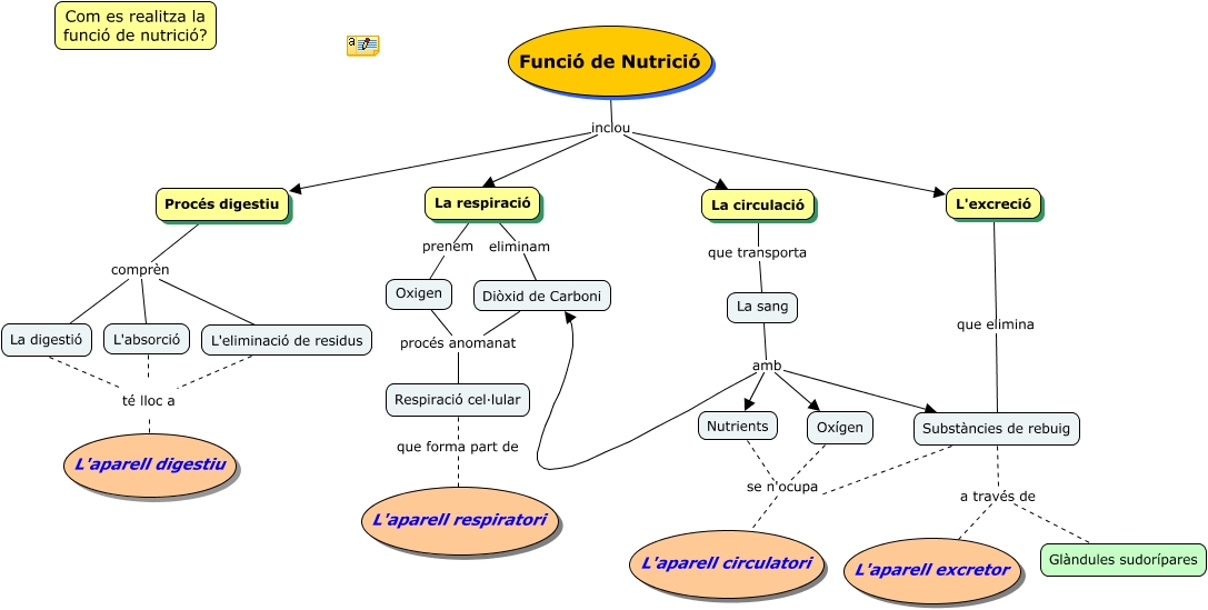 Aquest mapa conceptual conté informació relacionada amb: CURS CMAPTOOLS MAIG 2014, La sang amb Substàncies de rebuig, Procés digestiu comprèn L'absorció, Substàncies de rebuig a través de Glàndules sudorípares, La sang amb Diòxid de Carboni, Respiració cel·lular que forma part de L'aparell respiratori, La respiració eliminam Diòxid de Carboni, L'excreció que elimina Substàncies de rebuig, La respiració prenem Oxigen, Funció de Nutrició inclou Procés digestiu, Oxigen procés anomanat Respiració cel·lular, Diòxid de Carboni procés anomanat Respiració cel·lular, Substàncies de rebuig a través de L'aparell excretor, La sang amb Nutrients, La digestió té lloc a L'aparell digestiu, Funció de Nutrició inclou La respiració, Oxígen se n'ocupa L'aparell circulatori, Substàncies de rebuig se n'ocupa L'aparell circulatori, L'absorció té lloc a L'aparell digestiu, Nutrients se n'ocupa L'aparell circulatori, Procés digestiu comprèn La digestió