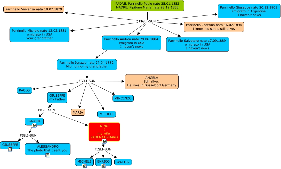 Questa Cmap, creata con IHMC CmapTools, contiene informazioni relative a: ALBERO bis, NINO I my wife PAOLA CORDARO FIGLI-SUN WALTER, Parrinello Ignazio nato 27.04.1882 Mio nonno-my grandfather FIGLI-SUN MARIA, Parrinello Ignazio nato 27.04.1882 Mio nonno-my grandfather FIGLI-SUN VINCENZO, PADRE, Parrinello Paolo nato 25.01.1852 MADRE, Pipitone Maria nata 28,12,1855 FIGLI-SUN Parrinello Andrea nato 29.06.1884 emigrato in USA I haven't news, Parrinello Ignazio nato 27.04.1882 Mio nonno-my grandfather FIGLI-SUN MICHELE, Parrinello Ignazio nato 27.04.1882 Mio nonno-my grandfather FIGLI-SUN GIUSEPPE my Father, Parrinello Ignazio nato 27.04.1882 Mio nonno-my grandfather FIGLI-SUN PAOLO, IGNAZIO FIGLI-SUN GIUSEPPE, PADRE, Parrinello Paolo nato 25.01.1852 MADRE, Pipitone Maria nata 28,12,1855 FIGLI-SUN Parrinello Caterina nata 16.02.1894 I know his son is still alive., IGNAZIO FIGLI-SUN ALESSANDRO The photo that I sent you., PADRE, Parrinello Paolo nato 25.01.1852 MADRE, Pipitone Maria nata 28,12,1855 FIGLI-SUN Parrinello Michele nato 12.02.1881 emigrato in USA your grandfather, PADRE, Parrinello Paolo nato 25.01.1852 MADRE, Pipitone Maria nata 28,12,1855 FIGLI-SUN Parrinello Vincenza nata 18.07.1879, Parrinello Ignazio nato 27.04.1882 Mio nonno-my grandfather FIGLI-SUN ANGELA Still alive. He lives in Düsseldorf Germany, GIUSEPPE my Father FIGLI-SUN IGNAZIO, NINO I my wife PAOLA CORDARO FIGLI-SUN ENRICO, NINO I my wife PAOLA CORDARO FIGLI-SUN MICHELE, PADRE, Parrinello Paolo nato 25.01.1852 MADRE, Pipitone Maria nata 28,12,1855 FIGLI-SUN Parrinello Giuseppe nato 20.12.1901 emigrato in Argentina. I haven't news, PADRE, Parrinello Paolo nato 25.01.1852 MADRE, Pipitone Maria nata 28,12,1855 FIGLI-SUN Parrinello Salvatore nato 17.09.1889 emigrato in USA I haven't news, GIUSEPPE my Father FIGLI-SUN NINO I my wife PAOLA CORDARO, PADRE, Parrinello Paolo nato 25.01.1852 MADRE, Pipitone Maria nata 28,12,1855 FIGLI-SUN Parrinello Ignazio nato 27.04.1882 Mio nonno-my grandfather