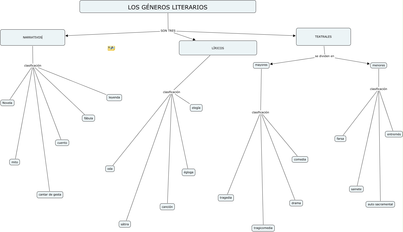 Este Cmap, tiene información relacionada con: Copia de géneros literarios, menores clasificación auto sacramental, menores clasificación sainete, LÍRICOS clasificación elegía, NARRATIVOS clasificación mito, mayores clasificación tragedia, LÍRICOS clasificación canción, mayores clasificación tragicomedia, LÍRICOS clasificación égloga, mayores clasificación drama, LOS GÉNEROS LITERARIOS SON TRES TEATRALES, NARRATIVOS clasificación cantar de gesta, TEATRALES se dividen en mayores, LOS GÉNEROS LITERARIOS SON TRES NARRATIVOS, LÍRICOS clasificación sátira, NARRATIVOS clasificación cuento, menores clasificación farsa, NARRATIVOS clasificación fábula, LOS GÉNEROS LITERARIOS SON TRES LÍRICOS, NARRATIVOS clasificación leyenda, TEATRALES se dividen en menores