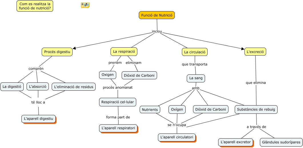 Aquest mapa conceptual conté informació relacionada amb: Copia de CURS CMAPTOOLS MAIG 2014, La sang amb Substàncies de rebuig, Procés digestiu comprèn L'absorció, Substàncies de rebuig a través de Glàndules sudorípares, La respiració eliminam Diòxid de Carboni, L'excreció que elimina Substàncies de rebuig, La respiració prenem Oxigen, Funció de Nutrició inclou La respiració, Diòxid de Carboni se n'ocupa L'aparell circulatori, Funció de Nutrició inclou Procés digestiu, Oxigen procés anomanat Respiració cel·lular, Diòxid de Carboni procés anomanat Respiració cel·lular, Substàncies de rebuig a través de L'aparell excretor, La sang amb Nutrients, La digestió té lloc a L'aparell digestiu, Respiració cel·lular forma part de L'aparell respiratori, Oxígen se n'ocupa L'aparell circulatori, Substàncies de rebuig se n'ocupa L'aparell circulatori, L'absorció té lloc a L'aparell digestiu, La sang amb Diòxid de Carboni, Nutrients se n'ocupa L'aparell circulatori