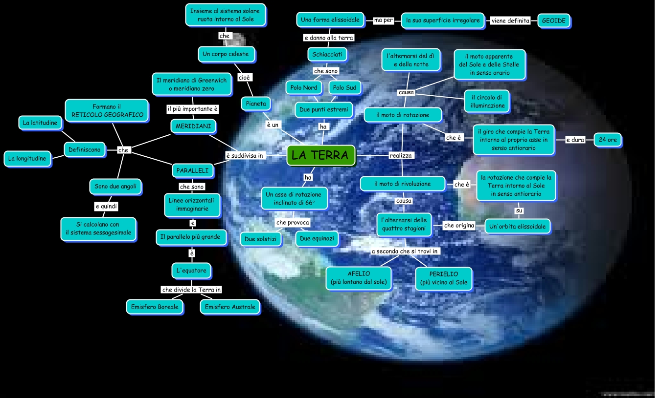 Questa Cmap, creata con IHMC CmapTools, contiene informazioni relative a: La Terra, Un asse di rotazione inclinato di 66° che provoca Due equinozi, L'equatore che divide la Terra in Emisfero Australe, Sono due angoli e quindi Si calcolano con il sistema sessagesimale, LA TERRA ha Due punti estremi, la rotazione che compie la Terra intorno al Sole in senso antiorario su Un'orbita elissoidale, Un corpo celeste che Insieme al sistema solare ruota intorno al Sole, PARALLELI che Formano il RETICOLO GEOGRAFICO, LA TERRA realizza il moto di rivoluzione, LA TERRA è suddivisa in MERIDIANI, Linee orizzontali immaginarie e Il parallelo più grande, MERIDIANI che Definiscono, MERIDIANI il più importante è Il meridiano di Greenwich o meridiano zero, L'equatore che divide la Terra in Emisfero Boreale, Un'orbita elissoidale che origina l'alternarsi delle quattro stagioni, LA TERRA è suddivisa in PARALLELI, il giro che compie la Terra intorno al proprio asse in senso antiorario e dura 24 ore, Schiacciati e danno alla terra Una forma elissoidale, la sua superficie irregolare viene definita GEOIDE, MERIDIANI che Formano il RETICOLO GEOGRAFICO, Due punti estremi Polo Nord