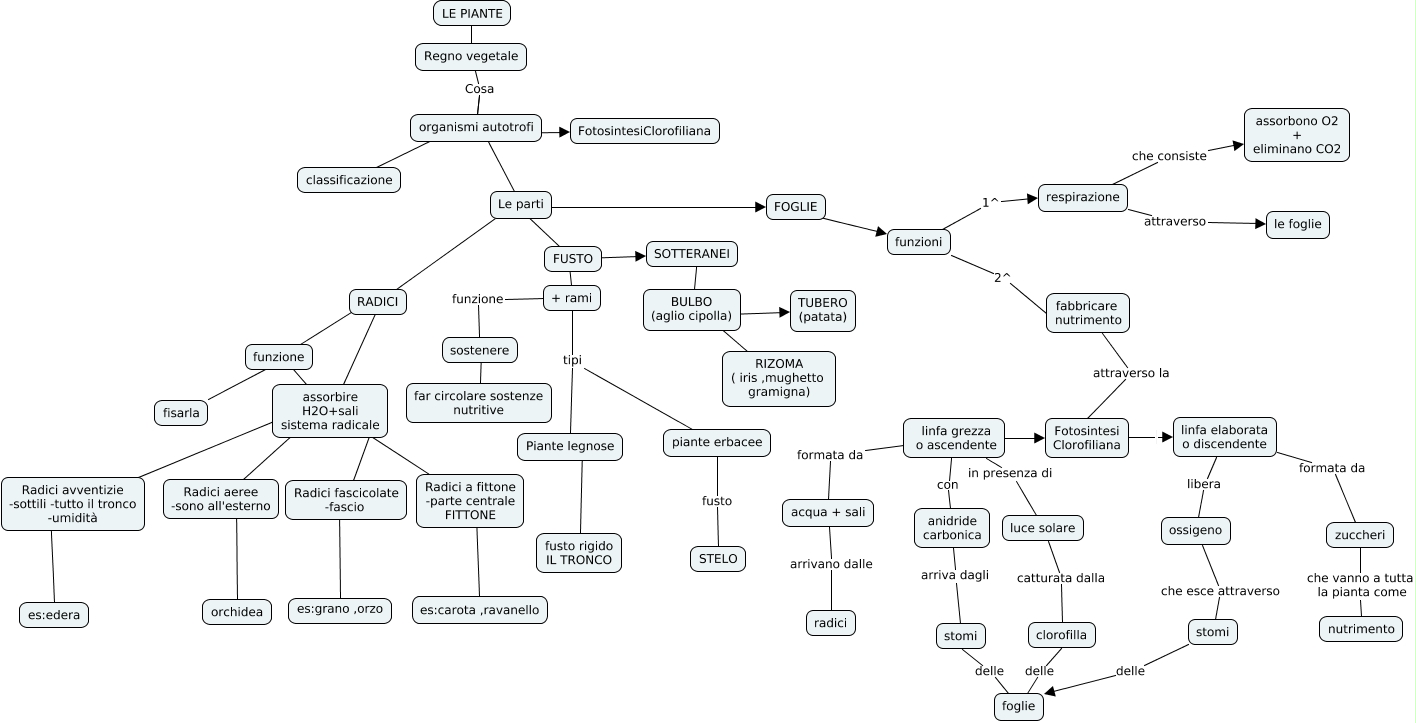 Questa Cmap, creata con IHMC CmapTools, contiene informazioni relative a: Le piante 16maggio2014, linfa grezza o ascendente formata da acqua + sali, acqua + sali arrivano dalle radici, respirazione che consiste assorbono O2 + eliminano CO2, organismi autotrofi ???? FotosintesiClorofiliana, linfa elaborata o discendente libera ossigeno, luce solare catturata dalla clorofilla, Fotosintesi Clorofiliana linfa elaborata o discendente, piante erbacee fusto STELO, assorbire H2O+sali sistema radicale ???? Radici aeree -sono all'esterno, sostenere ???? far circolare sostenze nutritive, respirazione attraverso le foglie, BULBO (aglio cipolla) ???? TUBERO (patata), RADICI ???? assorbire H2O+sali sistema radicale, + rami tipi piante erbacee, Radici a fittone -parte centrale FITTONE ???? es:carota ,ravanello, funzione ???? assorbire H2O+sali sistema radicale, Radici fascicolate -fascio ???? es:grano ,orzo, stomi delle foglie, SOTTERANEI ???? BULBO (aglio cipolla), FUSTO ???? SOTTERANEI