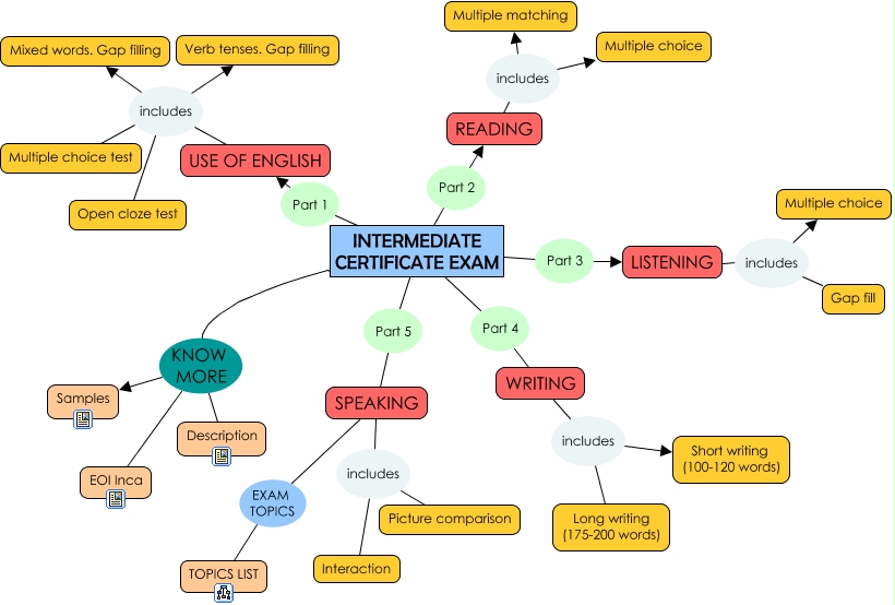 Este Cmap, tiene información relacionada con: ElisabetPrim_CertificateExam2, INTERMEDIATE CERTIFICATE EXAM KNOW MORE Samples, INTERMEDIATE CERTIFICATE EXAM KNOW MORE Description, SPEAKING includes Interaction, WRITING includes Long writing (175-200 words), USE OF ENGLISH includes Mixed words. Gap filling, INTERMEDIATE CERTIFICATE EXAM Part 2 READING, WRITING includes Short writing (100-120 words), SPEAKING includes Picture comparison, USE OF ENGLISH includes Verb tenses. Gap filling, USE OF ENGLISH includes Open cloze test, INTERMEDIATE CERTIFICATE EXAM Part 4 WRITING, LISTENING includes Gap fill, LISTENING includes Multiple choice, READING includes Multiple choice, SPEAKING EXAM TOPICS TOPICS LIST, USE OF ENGLISH includes Multiple choice test, INTERMEDIATE CERTIFICATE EXAM KNOW MORE EOI Inca, READING includes Multiple matching, INTERMEDIATE CERTIFICATE EXAM Part 1 USE OF ENGLISH, INTERMEDIATE CERTIFICATE EXAM Part 3 LISTENING