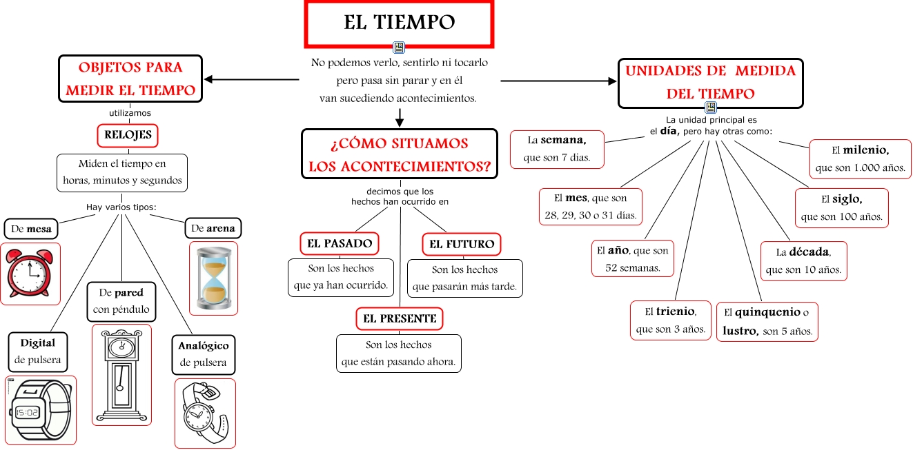 Este Cmap, tiene información relacionada con: EL TIEMPO, UNIDADES DE MEDIDA DEL TIEMPO La unidad principal es el día, pero hay otras como: El trienio, que son 3 años., EL TIEMPO No podemos verlo, sentirlo ni tocarlo pero pasa sin parar y en él van sucediendo acontecimientos. OBJETOS PARA MEDIR EL TIEMPO, UNIDADES DE MEDIDA DEL TIEMPO La unidad principal es el día, pero hay otras como: La década, que son 10 años., EL FUTURO ???? Son los hechos que pasarán más tarde., UNIDADES DE MEDIDA DEL TIEMPO La unidad principal es el día, pero hay otras como: El mes, que son 28, 29, 30 o 31 días., UNIDADES DE MEDIDA DEL TIEMPO La unidad principal es el día, pero hay otras como: El año, que son 52 semanas., ¿CÓMO SITUAMOS LOS ACONTECIMIENTOS? decimos que los hechos han ocurrido en EL PRESENTE, UNIDADES DE MEDIDA DEL TIEMPO La unidad principal es el día, pero hay otras como: El quinquenio o lustro, son 5 años., EL TIEMPO No podemos verlo, sentirlo ni tocarlo pero pasa sin parar y en él van sucediendo acontecimientos. UNIDADES DE MEDIDA DEL TIEMPO, Miden el tiempo en horas, minutos y segundos Hay varios tipos: De pared con péndulo, OBJETOS PARA MEDIR EL TIEMPO utilizamos RELOJES, RELOJES Miden el tiempo en horas, minutos y segundos, UNIDADES DE MEDIDA DEL TIEMPO La unidad principal es el día, pero hay otras como: La semana, que son 7 dias., Miden el tiempo en horas, minutos y segundos Hay varios tipos: De arena, Miden el tiempo en horas, minutos y segundos Hay varios tipos: Analógico de pulsera, ¿CÓMO SITUAMOS LOS ACONTECIMIENTOS? decimos que los hechos han ocurrido en EL PASADO, EL PRESENTE ???? Son los hechos que están pasando ahora., EL TIEMPO No podemos verlo, sentirlo ni tocarlo pero pasa sin parar y en él van sucediendo acontecimientos. ¿CÓMO SITUAMOS LOS ACONTECIMIENTOS?, ¿CÓMO SITUAMOS LOS ACONTECIMIENTOS? decimos que los hechos han ocurrido en EL FUTURO, Miden el tiempo en horas, minutos y segundos Hay varios tipos: Digital de pulsera
