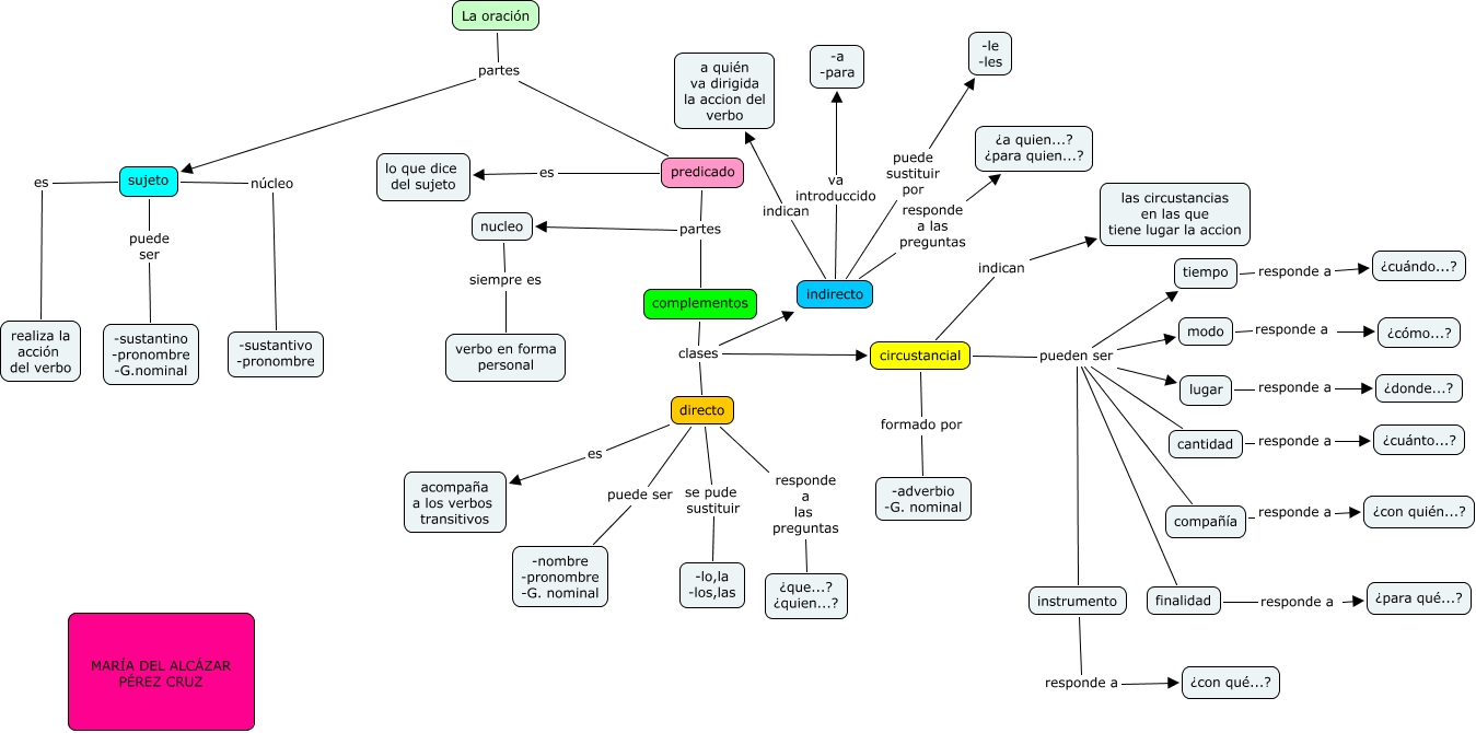 Este Cmap, tiene información relacionada con: partes de la oracion-maria alcazar, circustancial indican las circustancias en las que tiene lugar la accion, finalidad responde a ¿para qué...?, indirecto puede sustituir por -le -les, lugar responde a ¿donde...?, directo es acompaña a los verbos transitivos, circustancial formado por -adverbio -G. nominal, circustancial pueden ser tiempo, sujeto es realiza la acción del verbo, modo responde a ¿cómo...?, La oración partes sujeto, circustancial pueden ser cantidad, circustancial pueden ser instrumento, predicado es lo que dice del sujeto, cantidad responde a ¿cuánto...?, instrumento responde a ¿con qué...?, tiempo responde a ¿cuándo...?, directo se pude sustituir -lo,la -los,las, predicado partes complementos, La oración partes predicado, indirecto responde a las preguntas ¿a quien...? ¿para quien...?