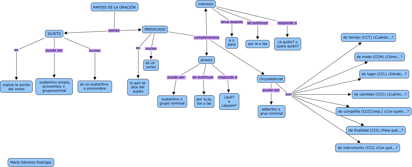 Este Cmap, tiene información relacionada con: PARTES DE LA ORACIÓN-maria-sanchez, directo se sustituye por lo,la, los y las, circunstancial son de compañia (CCCComp.) ¿Con quién...?, circunstancial son de lugar (CCL) ¿Dónde...?, indirecto responde a ¿a quién? o ¿para quién?, PREDICADO complementos circunstancial, circunstancial puede ser adberbio o gruo nominal, SUJETO es realiza la acción del verbo, circunstancial son de instrumento (CCI) ¿Con qué...?, SUJETO puede ser sustantivo propio, pronombre o gruponominal, indirecto lleva delante a o para, PREDICADO complementos directo, PREDICADO complementos indirecto, directo responde a ¿qué? o ¿aquien?, PARTES DE LA ORACIÓN partes SUJETO, circunstancial son de tiempo (CCT) ¿Cuándo...?, SUJETO nucleo es un sustantivo o pronombre, indirecto se sustituye por le o les, PARTES DE LA ORACIÓN partes PREDICADO, circunstancial son de modo (CCM) ¿Cómo...?, PREDICADO es lo que se dice del sujeto