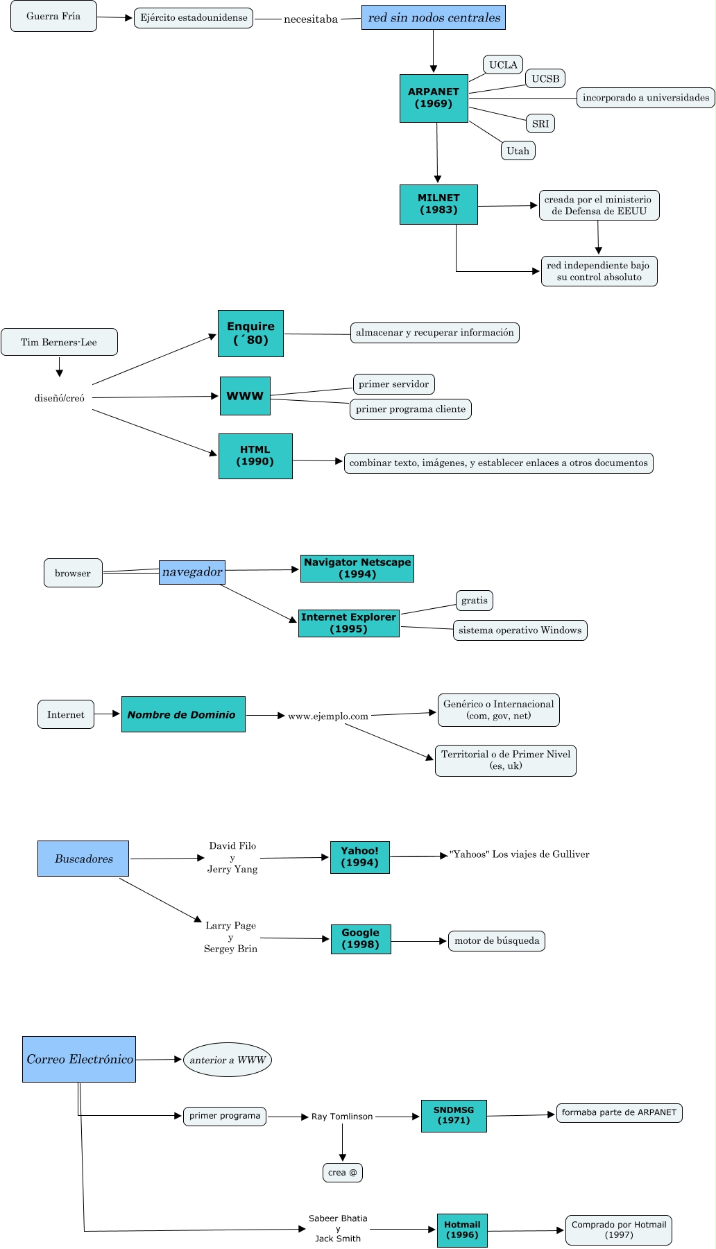 Este Cmap, tiene información relacionada con: M.E.Iglesias - Historia de Internet, HTML (1990) ???? combinar texto, imágenes, y establecer enlaces a otros documentos, Correo Electrónico Sabeer Bhatia y Jack Smith Hotmail (1996), Hotmail (1996) ???? Comprado por Hotmail (1997), primer programa cliente ???? WWW, browser ???? navegador, Ejército estadounidense necesitaba red sin nodos centrales, Correo Electrónico ???? anterior a WWW, red sin nodos centrales ???? ARPANET (1969), Nombre de Dominio www.ejemplo.com Territorial o de Primer Nivel (es, uk), creada por el ministerio de Defensa de EEUU ???? red independiente bajo su control absoluto, Google (1998) . motor de búsqueda, browser ???? navegador, primer programa Ray Tomlinson SNDMSG (1971), ARPANET (1969) ???? incorporado a universidades, ARPANET (1969) ???? UCSB, Enquire (´80) ???? almacenar y recuperar información, Internet Explorer (1995) ???? gratis, Yahoo! (1994) "Yahoos" Los viajes de Gulliver ????, MILNET (1983) ???? creada por el ministerio de Defensa de EEUU, Buscadores Larry Page y Sergey Brin Google (1998)