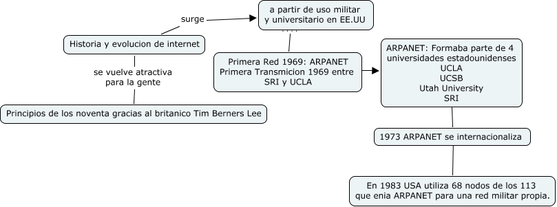 Este Cmap, tiene información relacionada con: historia del internet, ARPANET: Formaba parte de 4 universidades estadounidenses UCLA UCSB Utah University SRI ???? 1973 ARPANET se internacionaliza, Historia y evolucion de internet surge a partir de uso militar y universitario en EE.UU, Primera Red 1969: ARPANET Primera Transmicion 1969 entre SRI y UCLA ???? ARPANET: Formaba parte de 4 universidades estadounidenses UCLA UCSB Utah University SRI, 1973 ARPANET se internacionaliza ???? En 1983 USA utiliza 68 nodos de los 113 que enia ARPANET para una red militar propia., Historia y evolucion de internet se vuelve atractiva para la gente Principios de los noventa gracias al britanico Tim Berners Lee, a partir de uso militar y universitario en EE.UU ???? Primera Red 1969: ARPANET Primera Transmicion 1969 entre SRI y UCLA