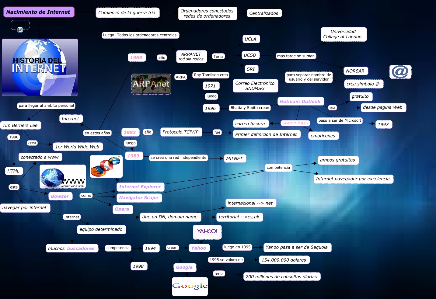Este Cmap, tiene información relacionada con: Historia de Internet por Cathe, HTML este navegar por internet, muchos buscadores competencia 1998, Hotmail: Outlook era gratuito, Bowser como Internet Explorer, Nacimiento de Internet ???? ????, Yahoo luego en 1995 Yahoo pasa a ser de Sequoia, Yahoo ???? ????, tine un DN, domain name puede ser territorial -->es,uk, Protocolo TCP/IP fue Primer definicion de Internet, Comienzó de la guerra fría Luego: Todos los ordenadores centrales ARPANET red sin nodos, Google tenia 200 millones de consultas diarias, Navigator Scape competencia ambos gratuitos, navegar por internet Internet muchos buscadores, SRI mas tarde se suman Universidad Collage of London, Bowser como Navigator Scape, tine un DN, domain name puede ser internacional --> net, Hotmail: Outlook SPAM Y MILEY correo basura, Internet Explorer ???? ????, muchos buscadores competencia 1994, 1994 crean Google