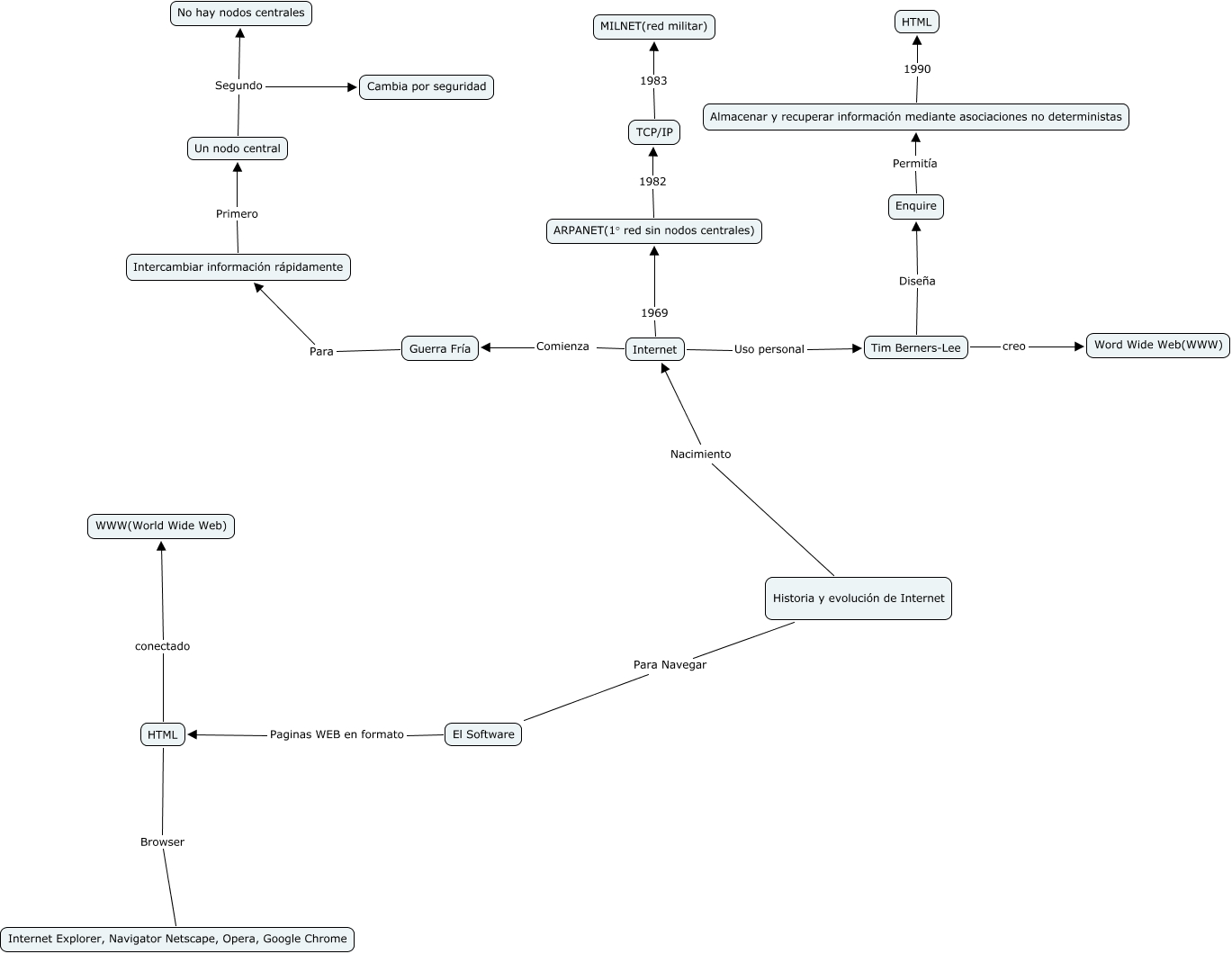 Este Cmap, tiene información relacionada con: Iniaki, Historia y evolución de Internet Para Navegar El Software, Enquire Permitía Almacenar y recuperar información mediante asociaciones no deterministas, Tim Berners-Lee Diseña Enquire, HTML Browser Internet Explorer, Navigator Netscape, Opera, Google Chrome, Un nodo central Segundo No hay nodos centrales, HTML conectado WWW(World Wide Web), TCP/IP 1983 MILNET(red militar), Internet Uso personal Tim Berners-Lee, Almacenar y recuperar información mediante asociaciones no deterministas 1990 HTML, Internet Comienza Guerra Fría, Internet 1969 ARPANET(1° red sin nodos centrales), Un nodo central Segundo Cambia por seguridad, Guerra Fría Para Intercambiar información rápidamente, Tim Berners-Lee creo Word Wide Web(WWW), Historia y evolución de Internet Nacimiento Internet, Intercambiar información rápidamente Primero Un nodo central, El Software Paginas WEB en formato HTML, ARPANET(1° red sin nodos centrales) 1982 TCP/IP