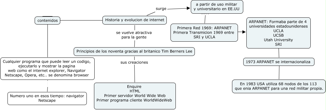 Este Cmap, tiene información relacionada con: historia del internet, 1973 ARPANET se internacionaliza ???? En 1983 USA utiliza 68 nodos de los 113 que enia ARPANET para una red militar propia., Principios de los noventa gracias al britanico Tim Berners Lee sus creaciones Enquire HTML Primer servidor World Wide Web Primer programa cliente WorldWideWeb, Historia y evolucion de internet ???? ????, Cualquier programa que puede leer un codigo, ejecutarlo y mostrar la pagina web como el internet explorer, Navigator Netscape, Opera, etc.. se denomina browser Numero uno en esos tiempo: navigator Netscape, Historia y evolucion de internet se vuelve atractiva para la gente Principios de los noventa gracias al britanico Tim Berners Lee, Primera Red 1969: ARPANET Primera Transmicion 1969 entre SRI y UCLA ???? ARPANET: Formaba parte de 4 universidades estadounidenses UCLA UCSB Utah University SRI, Historia y evolucion de internet surge a partir de uso militar y universitario en EE.UU, contenidos ???? Cualquier programa que puede leer un codigo, ejecutarlo y mostrar la pagina web como el internet explorer, Navigator Netscape, Opera, etc.. se denomina browser, ARPANET: Formaba parte de 4 universidades estadounidenses UCLA UCSB Utah University SRI ???? 1973 ARPANET se internacionaliza, a partir de uso militar y universitario en EE.UU ???? Primera Red 1969: ARPANET Primera Transmicion 1969 entre SRI y UCLA
