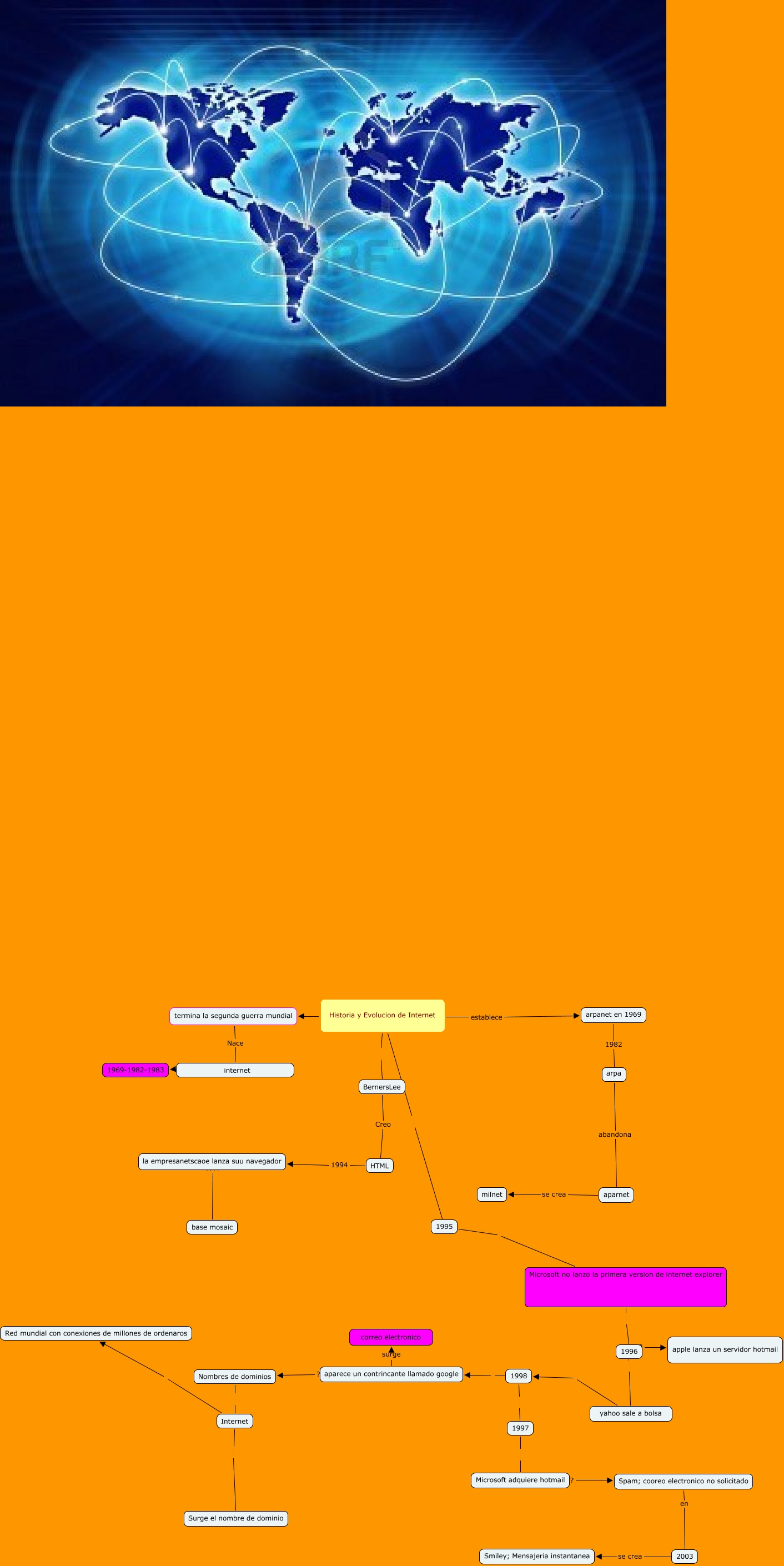 Este Cmap, tiene información relacionada con: Historia de Internet Aquino, Microsoft adquiere hotmail ???? Spam; cooreo electronico no solicitado, arpa abandona aparnet, Historia y Evolucion de Internet establece arpanet en 1969, Internet Red mundial con conexiones de millones de ordenaros, Nombres de dominios Internet, HTML 1994 la empresanetscaoe lanza suu navegador, Historia y Evolucion de Internet 1995, 1996 ???? apple lanza un servidor hotmail, yahoo sale a bolsa 1998, internet ???? 1969-1982-1983, 1995 Microsoft no lanzo la primera version de internet explorer, BernersLee Creo HTML, aparece un contrincante llamado google surge correo electronico, aparnet se crea milnet, Spam; cooreo electronico no solicitado en 2003, 2003 se crea Smiley; Mensajeria instantanea, aparece un contrincante llamado google ???? Nombres de dominios, 1998 1997, Historia y Evolucion de Internet BernersLee, Internet Surge el nombre de dominio