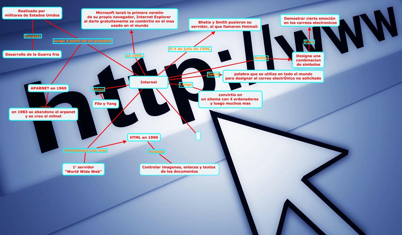 Este Cmap, tiene información relacionada con: historia e internet badoglio, Internet Spam palabra que se utiliza en todo el mundo para designar al correo electrÛnico no solicitado, Realizado por militares de Estados Unidos surge a partir de un proyecto APARNET en 1969, Internet ????, Internet El 4 de julio de 1996, Bhatia y Smith pusieron su servidor, al que llamaron Hotmail., Internet Yahoo Filo y Yang, Internet Tim Breners-Lee crea HTML en 1990, Internet Smiley Designa una combinacion de simbolos, Designa una combinacion de simbolos Para Demostrar cierta emoción en los correos electronicos, Internet en 1995 Microsoft lanzó la primera versión de su propio navegador, Internet Explorer al darlo gratuitamente se combirtio en el mas usado en el mundo, Internet surge a partir de un proyecto APARNET en 1969, Internet Tim Breners-Lee crea 1° servidor "World Wide Web", HTML en 1990 Permite Controlar imagenes, enlaces y textos de los documentos, Internet Luego convirtio en un sitema con 4 ordenadores y luego muchos mas, Realizado por militares de Estados Unidos Durante Desarrollo de la Guerra fria, APARNET en 1969 ???? en 1983 se abandono el arpanet y se creo el milnet